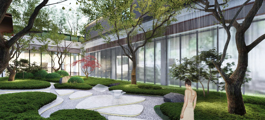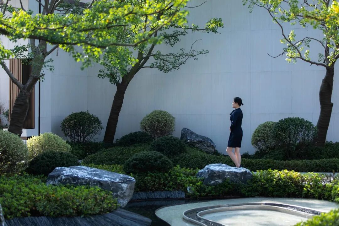 根据不同空间需求进行植物配置,营造不同氛围。诗意水院植物搭配简洁为主,局部采用大叶黄杨、毛鹃组团种植,漂浮在砾石模拟的水面之上。下沉庭院景观微地形结合乌桕、造型红枫、鸡爪槭以及地被毛鹃,打造少即是多的景观庭院效果。