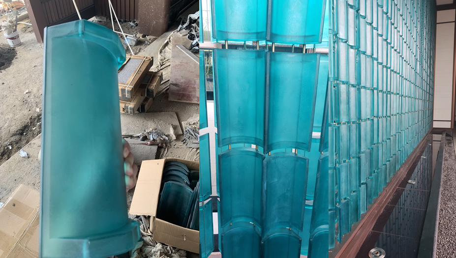 在整个施工过程中琉璃屏风主要难点在于玻璃瓦尺寸比例的控制、玻璃瓦安装方式及间距的控制、悬挂钢丝材质扣件造型等。玻璃的安装不仅需要考虑自身的荷载以及风荷载,同时玻璃的位置需要高度的统一,需要安装人员对卡扣的间距严格控制,安装过程中需要不断调整,对于整体的稳定性及精确性都是有极大的挑战性。为了确保落地效果,团队经过反复调整、测试,最终达到满意的效果。