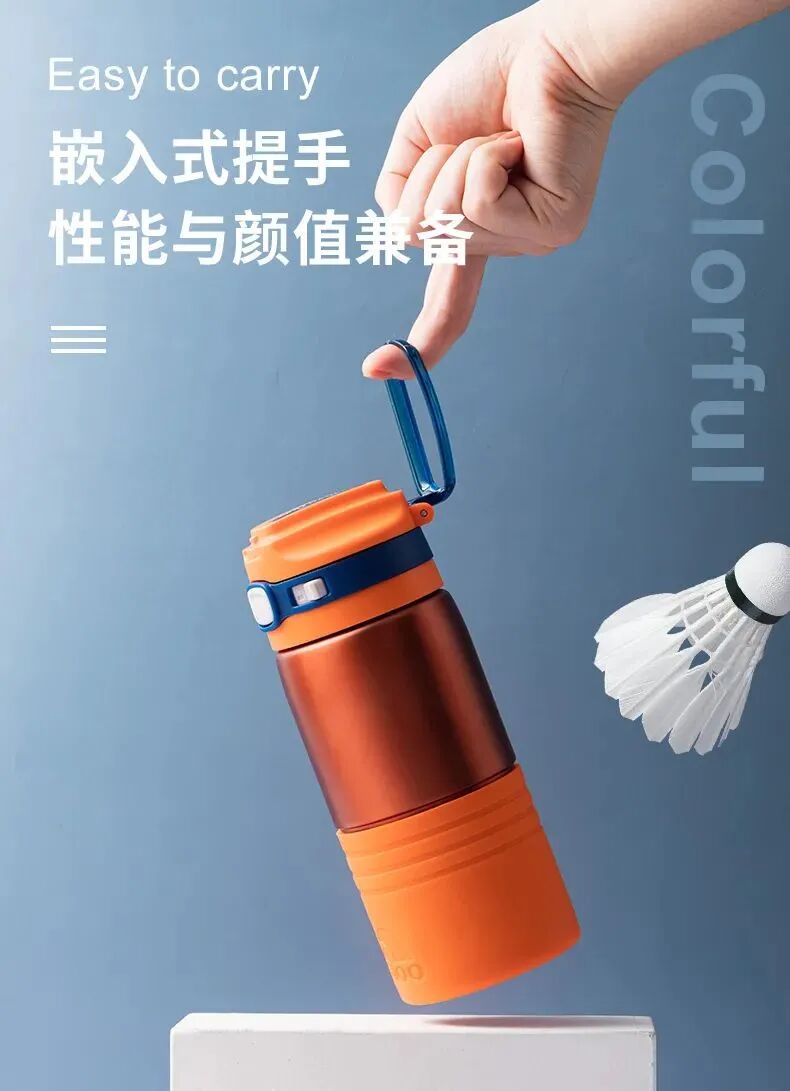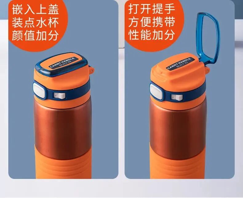2、嵌入式提手,性能与颜值兼备。嵌入上盖装点水杯颜值加分,打开提手方便携带性能加分。