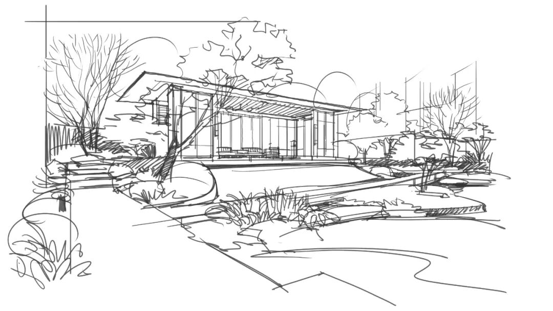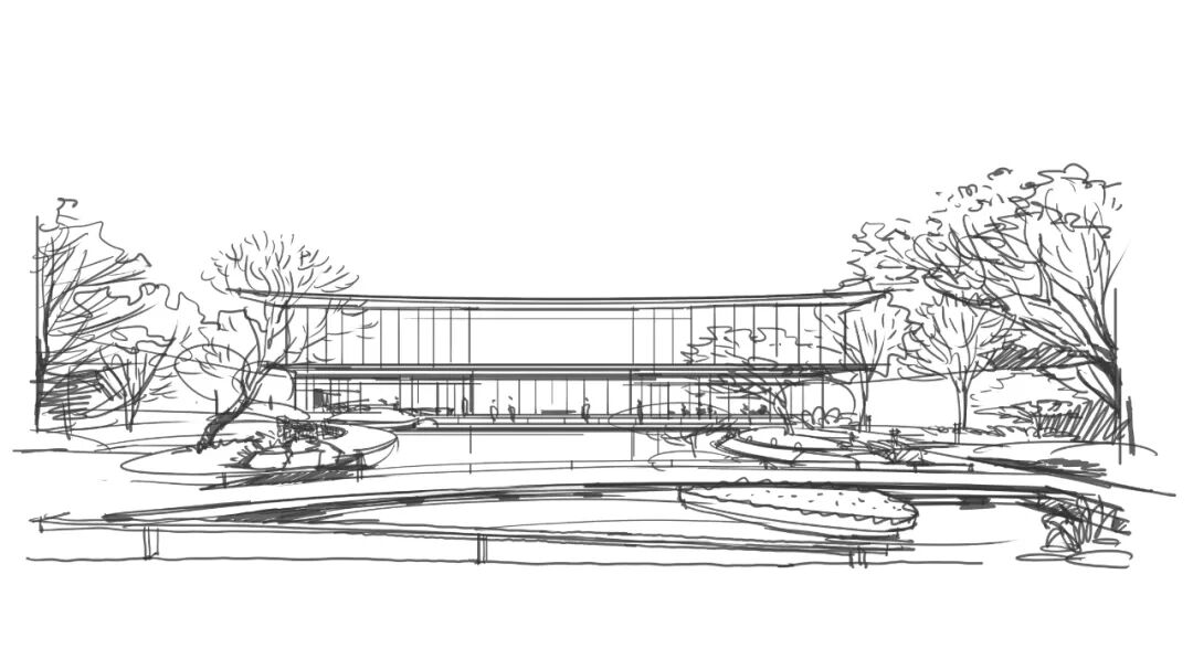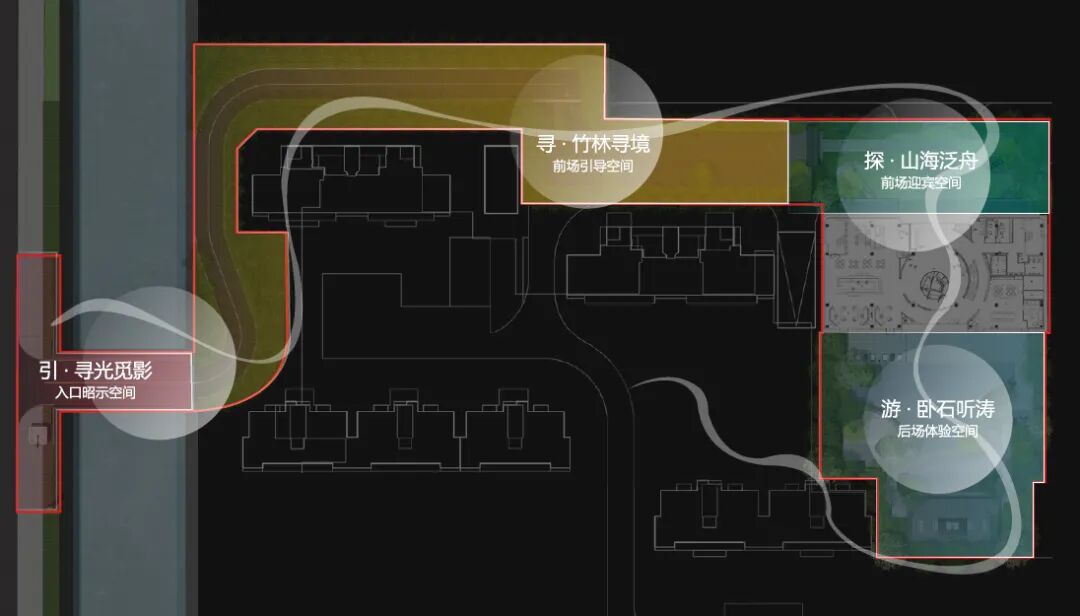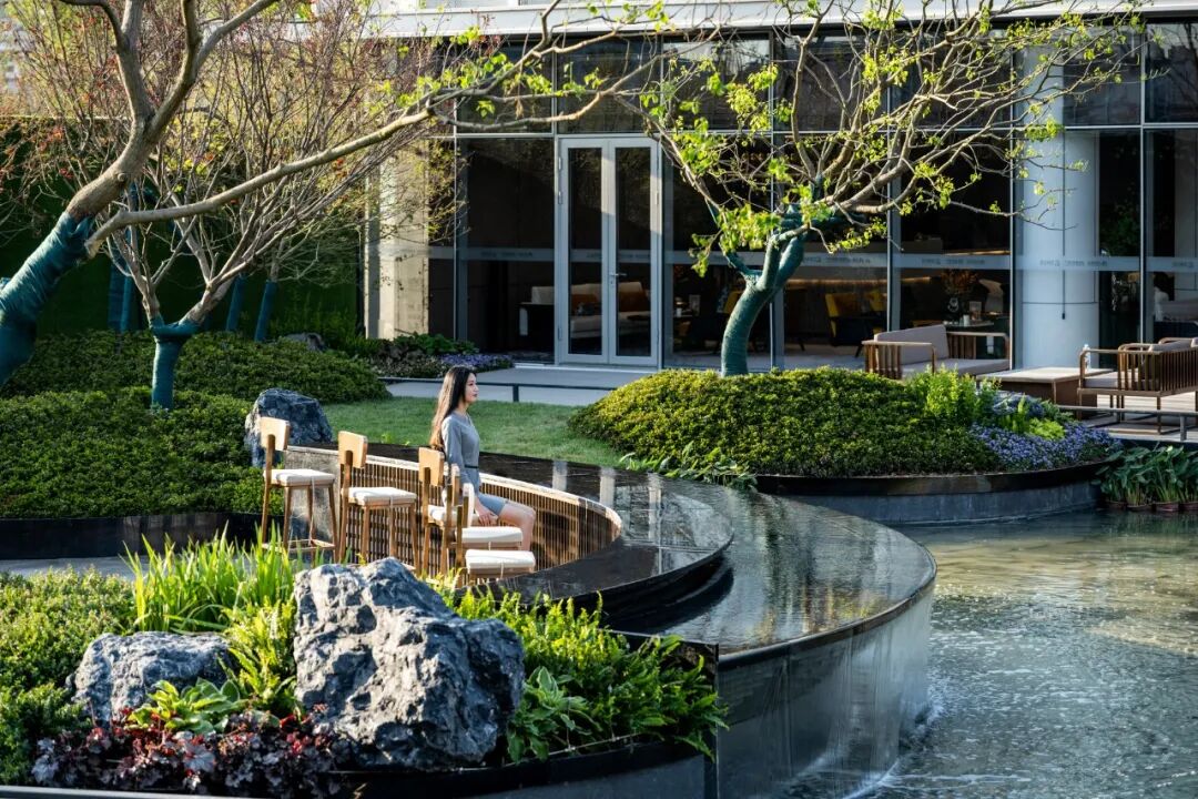 叠石理水,江南园林以水景擅长,水石相应,布局自由,建筑朴素,结构不拘泥于固定式。后场水景充分汲取东方园林的造景优势,围合型的园林格局,环游式园林设计丰富了体验动线,利用山石、特色种植池增加视觉空间层次。