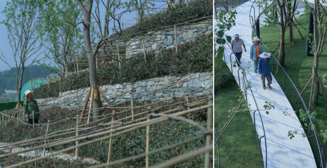 谈到反效能这一点,我想起了另一个项目。我们在一个有近20米高差的土地创面上恢复了原先的梯田状态和生产关系,并做了一列悬置的空中栈道作为进入社区的主要路径。