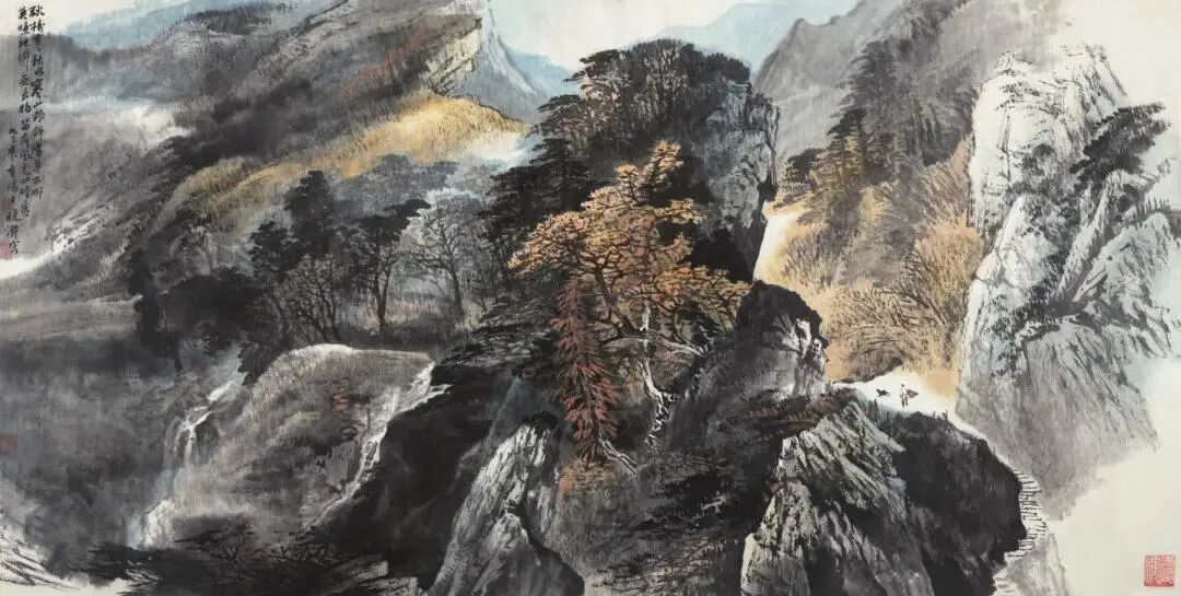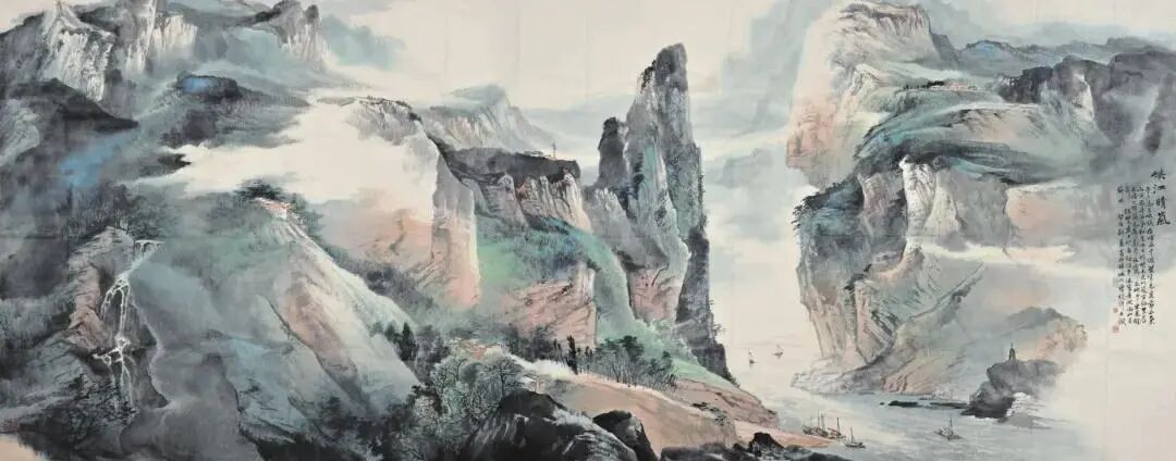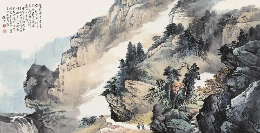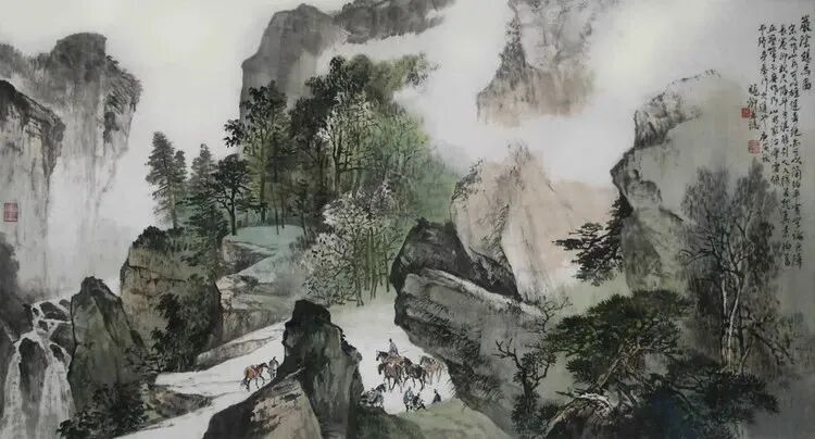 在吸取北派大师的苍莽浑厚和气势宏阔幽远的特性后,逐渐形成了表现湘南地域、气候等自然条件的清新图式,武陵源雄奇深邃的景象由气能扛鼎的劲健笔法表现出来,“真境逼而神境生”。