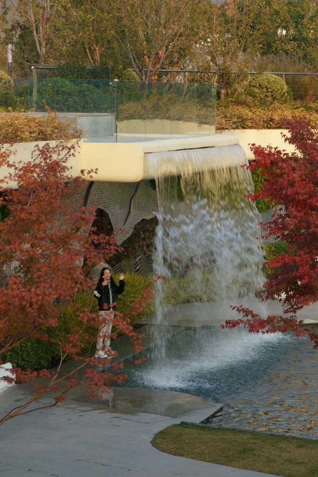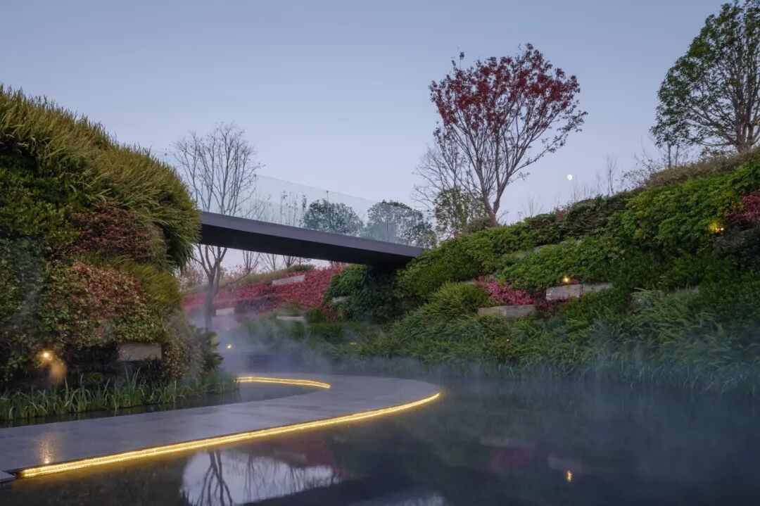 在上述园林空间骨架的基础上,设计将“水”元素利用到景观中,创造出了中央庭院的镜面水池和跌水瀑布、流水山谷中的人工溪流和缭绕云雾等不同形态的“水景观”,寓意山水相融并提升游客体验。在高低变化丰富的空间中,多样的水景还能与“光”元素产生呼应,产生动人的光影效果。