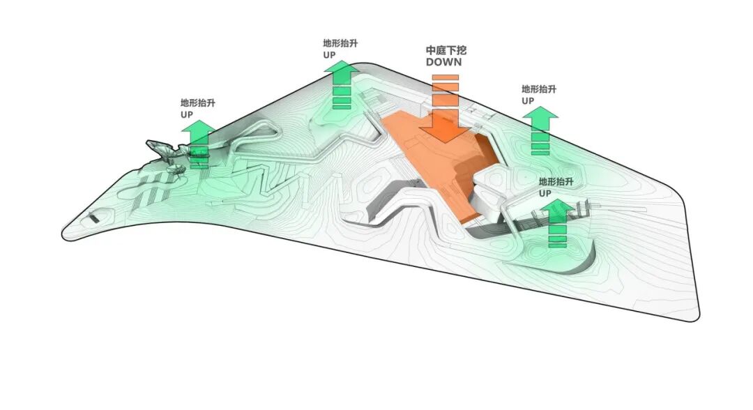 In order to create multifarious landscape experience in a limited space, the site is transformed from a monotonous plane space to a futuristic three-dimensional garden.  By operating the topography, undulating landscape hillsides, sunken central courtyards, and misty flowing valleys are created, which altogether form the framework of SHANGHAI GARDEN.