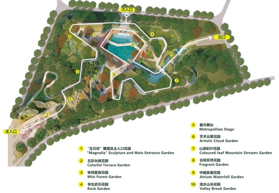 上海展园的设计方案在有限的展园空间内,向下、向上营造立体展示空间,将单调的平面空间转换为具有未来感的立体展园。通过地形营造,创造出了起伏的景观山坡、下凹的中央庭院、云雾缭绕的流水山谷等,这些共同构成了上海展园的园林空间骨架。