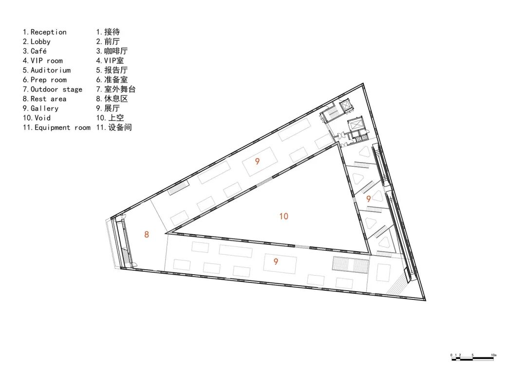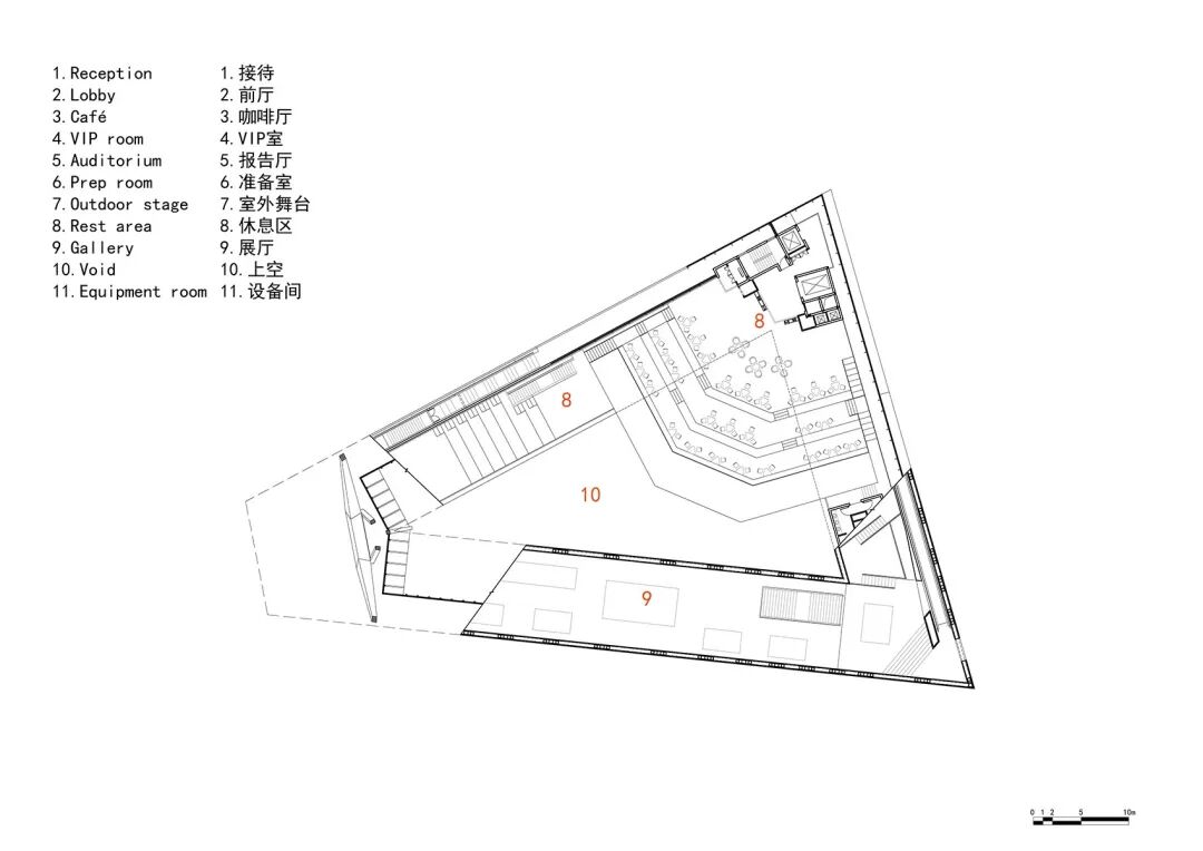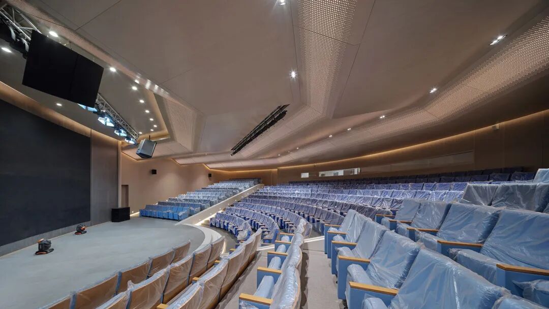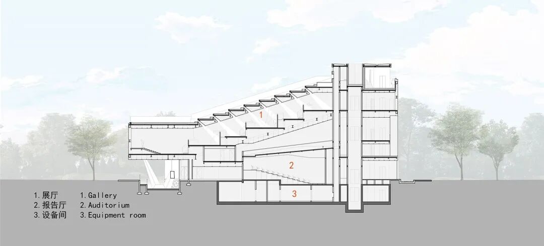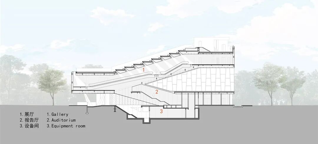 由坡道展厅所环绕的,是500座的报告厅及其上部的餐厅,以及首层的多功能大堂和咖啡厅。