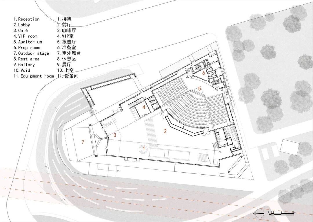 而绿谷艺术中心的落成也在这个重要的城市节点形成了一座公园:公园的景观大道在东北端结束于一个由建筑和景观共同围合而成的露天剧场,将艺术中心的公共性凝聚起来,使从各个方向进入公园的人流都可以自由地观看或参与这里的露天演出,也可以借由露天舞台背后的大堂进入建筑内部。