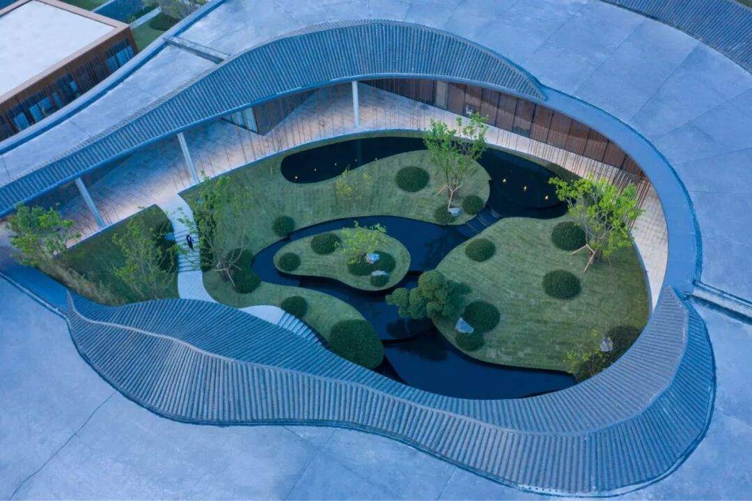在实际项目的落地过程中,由具体的使用需求,场地中形成了三栋建筑单体,同时也是三个不同姿态的“山”。因场地红线的限制,呈三角形布局。前山平缓,横向舒展。后山高耸,扑面而来。侧山则卧于一侧。角落一圆形“月塘”,成为实际功能中的泳池。