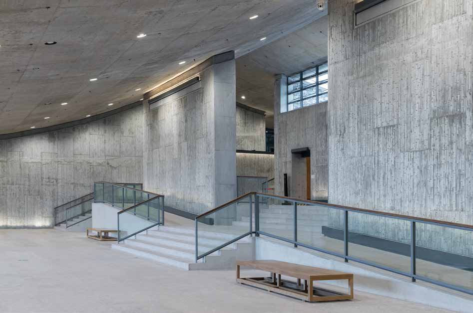 水池整体上呈现出挑的趋势,增强了建筑在沿湖界面的层次感。辅以堆坡设计,整体建筑体量在山体内凹的空间形态中突出。