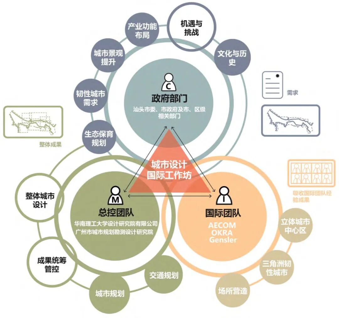 联合在三角洲韧性城市、场所营造、中心区立体城市等方面尤其擅长的荷兰OKRA景观建筑有限责任公司、中国香港AECOM艾奕康有限公司和美国Gensler晋思建筑设计事务所三家国际设计团队执行设计研究工作,并在相关工作阶段邀请市、区相关政府部门对成果进行咨询。在总控团队策划、组织及参与下,发挥各国际团队与总控团队专长,形成国际工作坊专题研究成果