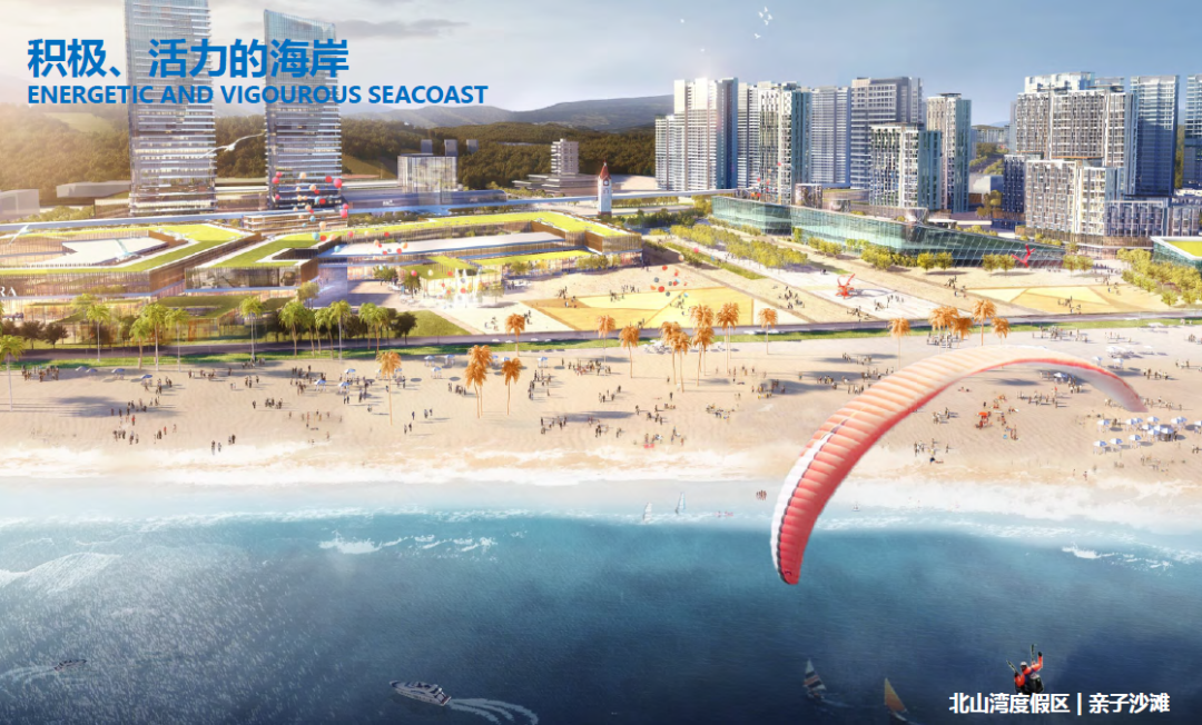 北山湾形成呼应北岸的以度假为主的亲子沙滩;山海通廊两侧适当布置商业设施,综合完善配套服务功能