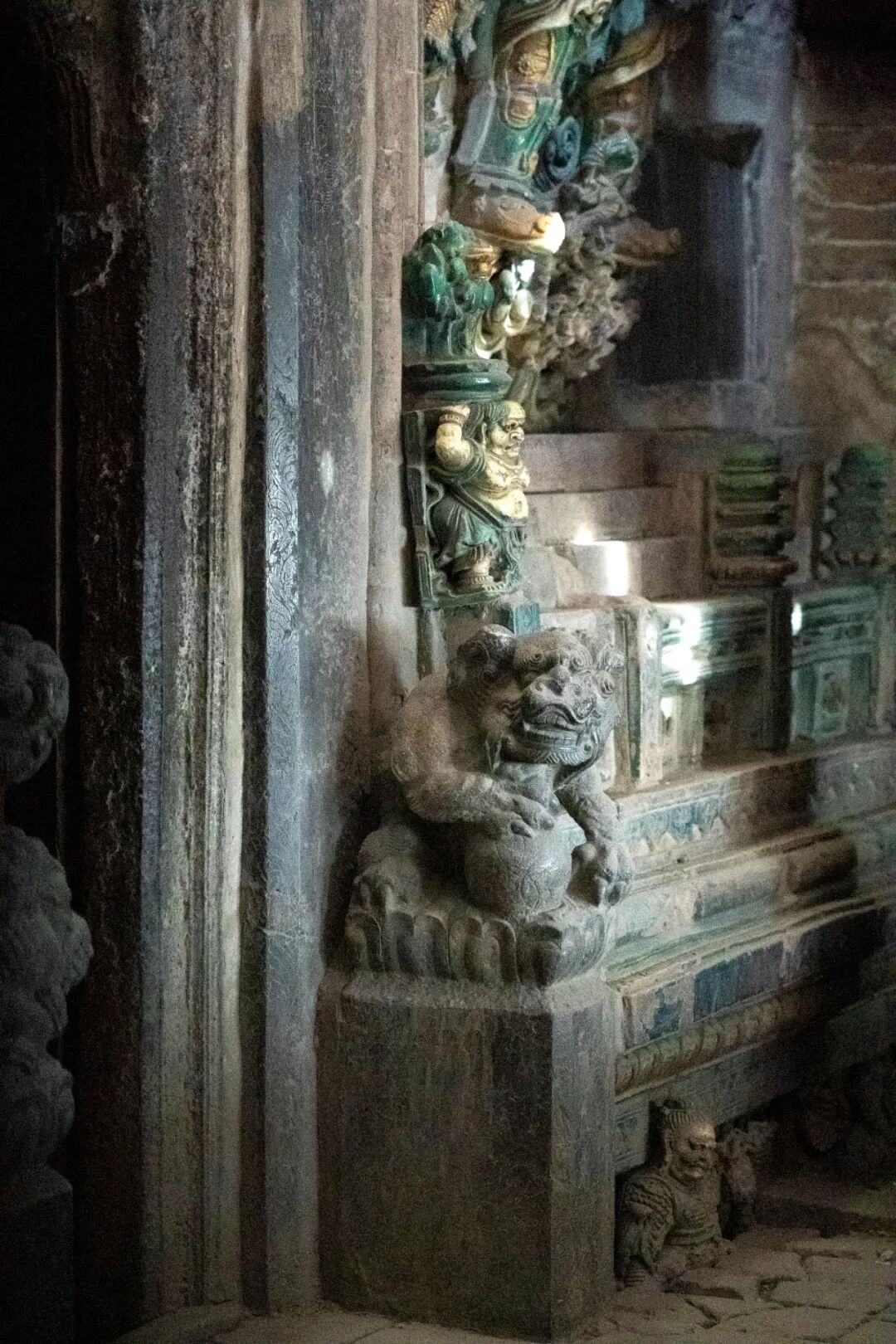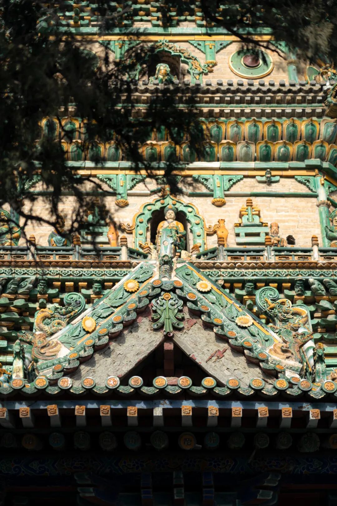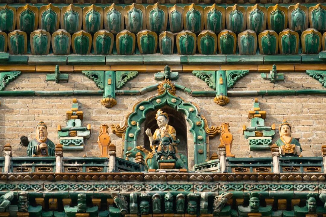 第三层四面正向施拱券,正中、侧角有四大天王、力士琉璃像,正南面的天王像两侧有明王驾龙琉璃像,正北则以凤凰居中,二金刚披甲跨兽胁侍两旁;