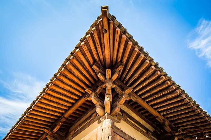 梁、柱、枋的结合更加紧凑,增强了建筑物的稳固性,同时令出檐深而不低暗,整座大殿自然而然的形成有张有弛、抑扬有序、轮廓秀丽、气势雄浑的风格。
