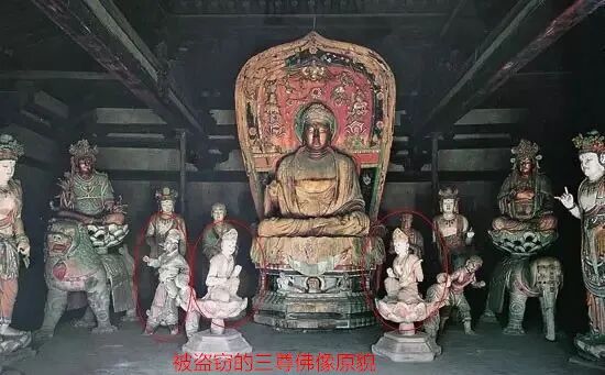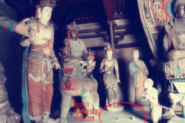 凿开了大殿里唐代佛像的胸膛,将其腹中珍宝偷走。其中文殊菩萨的背后也被破开洞口,其余佛像以相同的手段被破坏。唐代特有的两尊“似宫娃”供养菩萨被锯断劫走,当天盗走的还有狮童塑像。