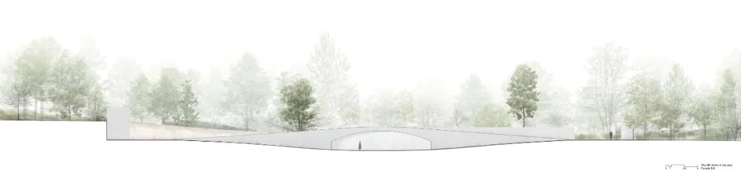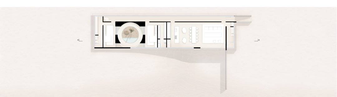 被水覆盖的下面是一个简单的线性设计,中间的圆形天窗打破沉闷感,引入自然光、打造室内通透的效果,公共区域面向水体,卧室空间隐藏其后。