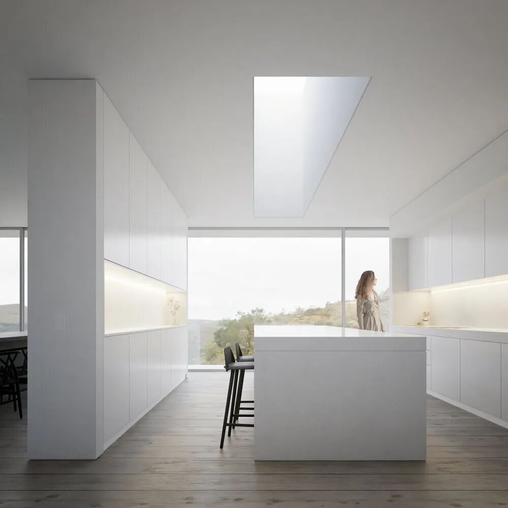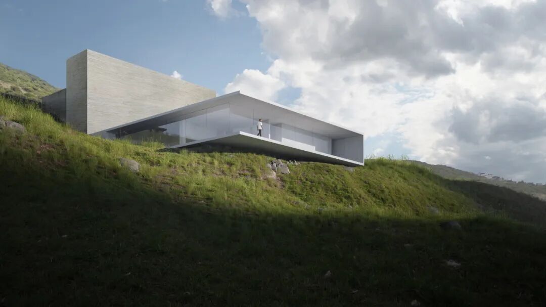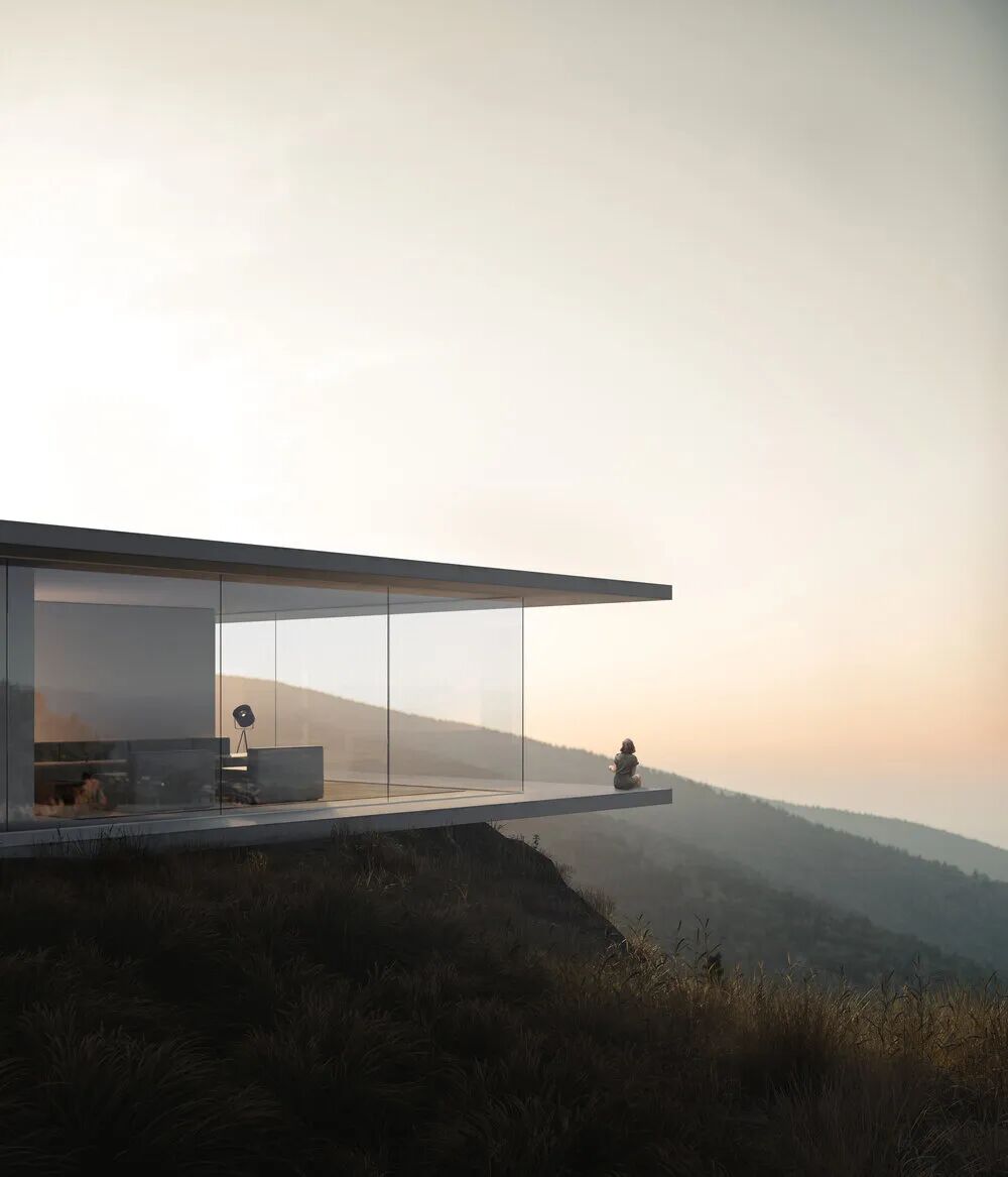 该住宅位于一片绿意盎然的山坡地上,壮阔的美景和背后的山脉为建筑营造一种宁静惬意的居住环境,简单的几何体块分割,开阔而洒脱,设计师使用大面积的玻璃在人造与自然、内部与外部之间进行平滑的过渡,令空间和人也成为自然的一部分。傍晚时分,落日余晖便会穿过玻璃洒落在室内,形成一方宁静且简练的天地。