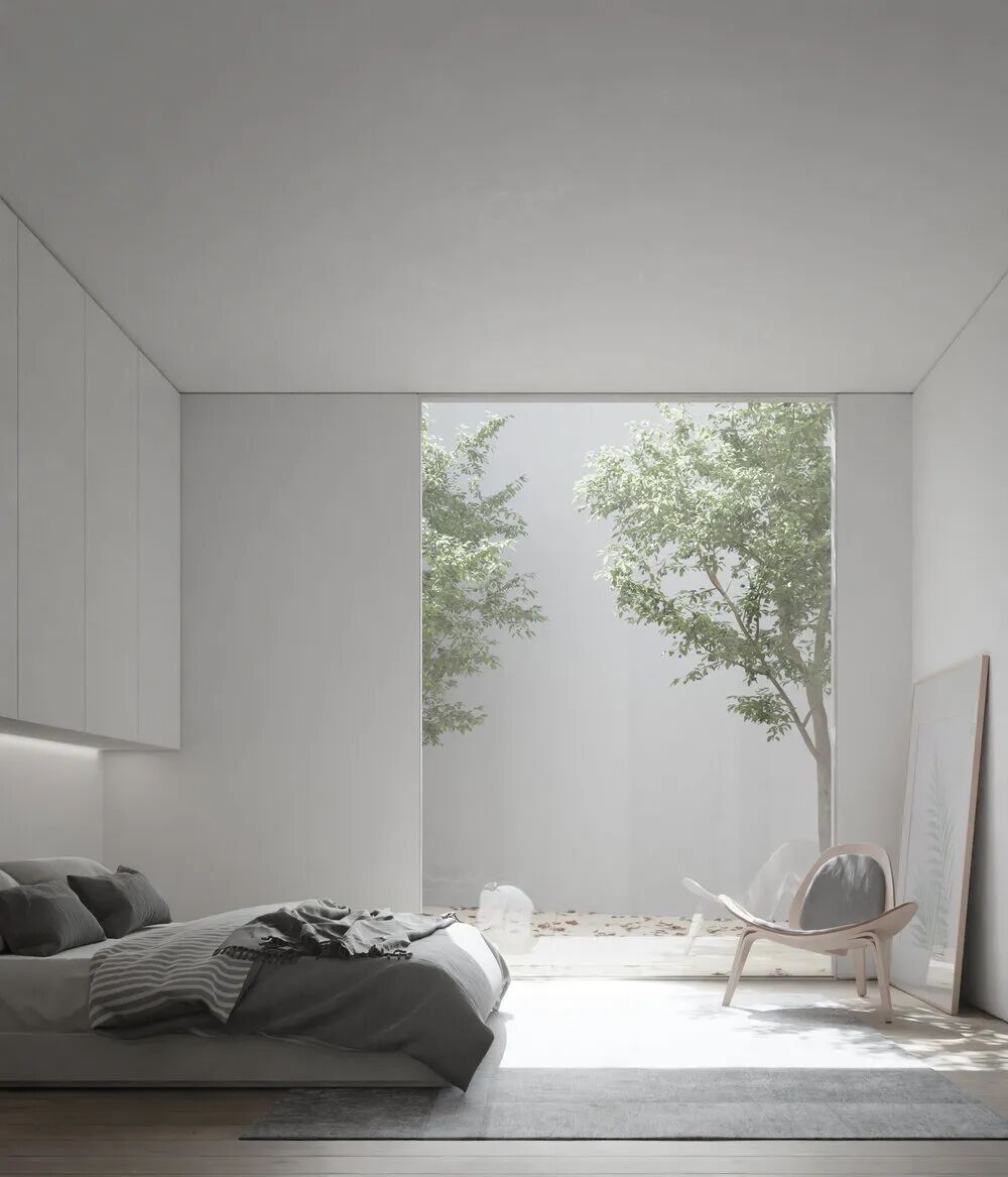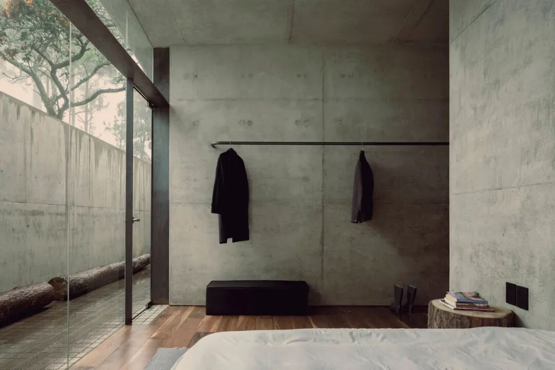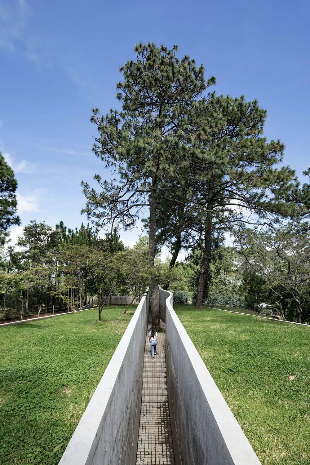 一条狭窄冗长的通道通往室内空间,尽头伫立着一棵老树,营造孤寂宁静感,住宅的公共区域完全裸露于繁茂的密林中,私人区域则朝向庭院开放,仅留一线天空和树冠作为背景。