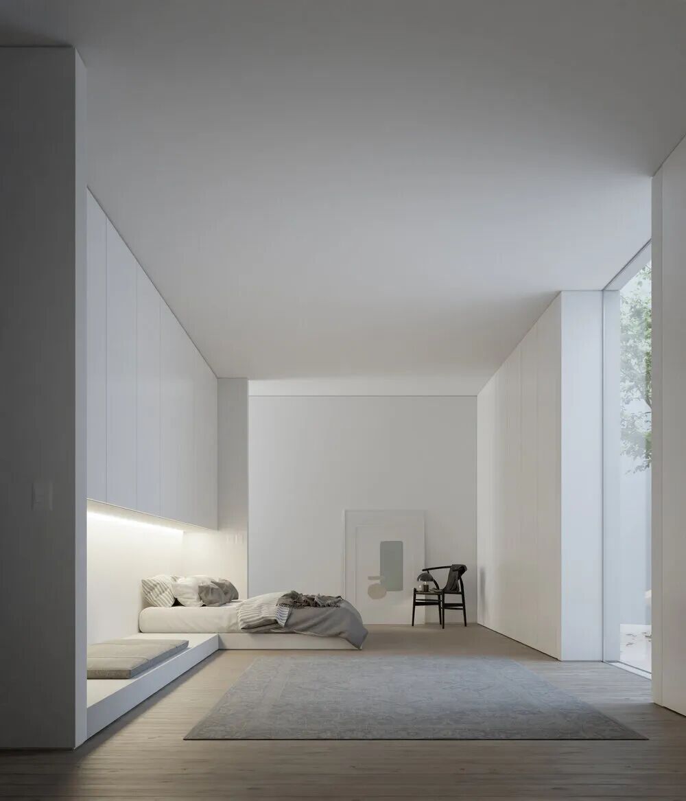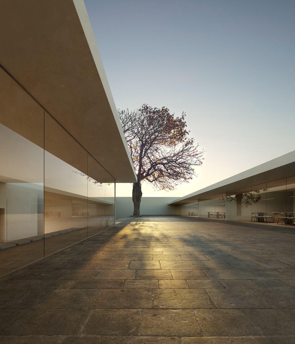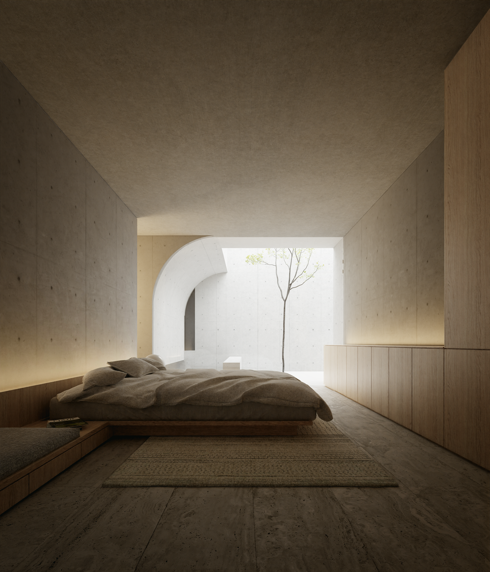 一条狭窄冗长的通道通往室内空间,尽头伫立着一棵老树,营造孤寂宁静感,住宅的公共区域完全裸露于繁茂的密林中,私人区域则朝向庭院开放,仅留一线天空和树冠作为背景。