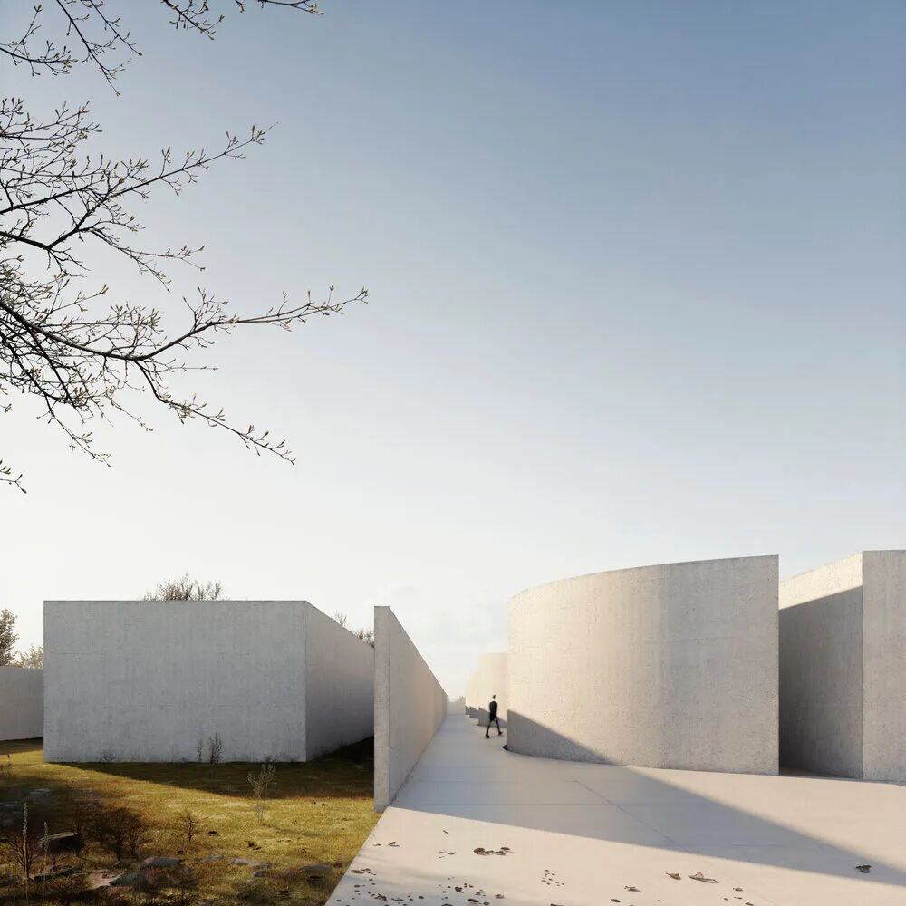 圆形是住宅设计,中间留有开口拥抱风景,灰色的树木和灌木、低矮的草,与蓝天形成强烈的对比,公共空间面向山脉,而私人空间面向后面庭院。