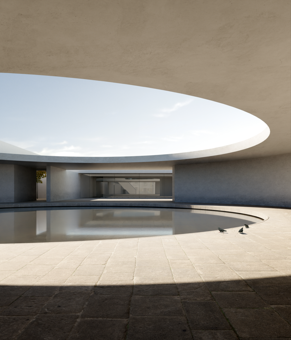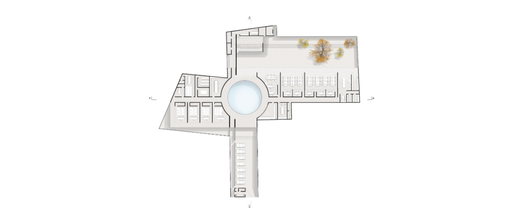 项目整体呈十字型布局,交叉点被设计成圆形的潜水池,薄薄的水面倒映出天空的颜色,员工在这里休憩时,能够像古代玛雅人在他们的天文台那样仰望星空,亲近自然。