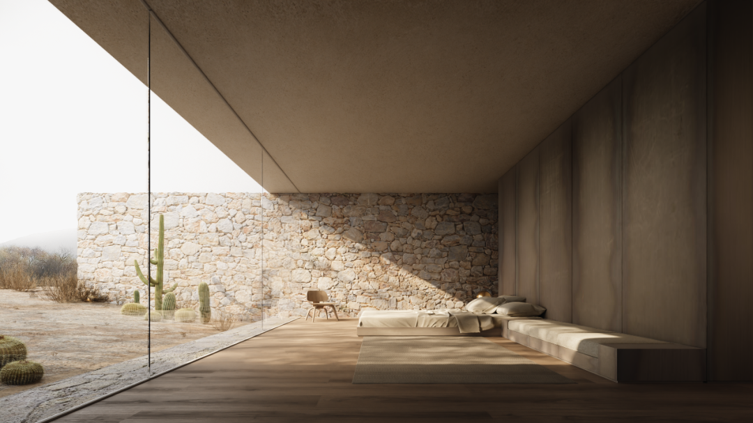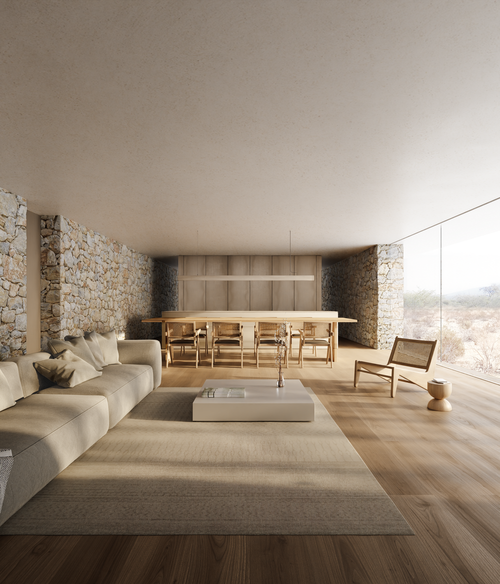 设计将可持续发展建筑与极简主义美学相结合,选当地毛石作为建筑的主要材料,开放式的起居空间将无限自然景观引入室内,给人一种原始自然的体验美感。