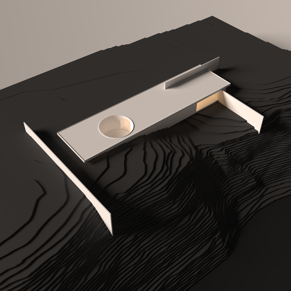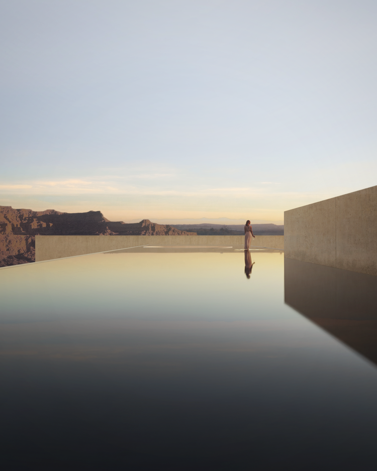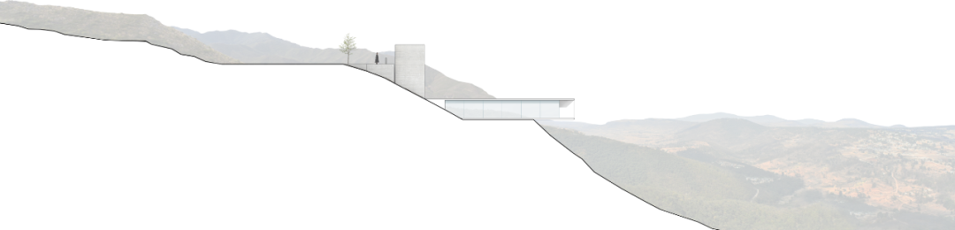 设计打造了一个沉默的、谨慎的建筑,住宅体量被嵌入岩石下,在上面盖了层薄薄的水面,以倒映出天空的色彩和缤纷日出日落;它可以保护房子免受强烈的阳光照射。