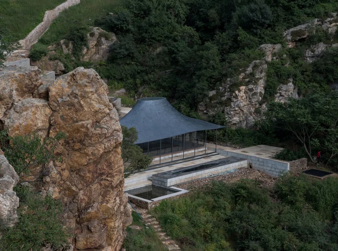山下的钢结构和碳纤维屋顶的禅堂是对中国汉字“舍”在象形意义上的重构。“舍”字由“亼+屮+囗”三部分组成,“亼”是屋顶,“屮”是梁柱,“囗”是基座,内外两圈纤细的钢柱支撑着曲面的屋顶,方形基座的高低变化在尺度上适应着山地的地形,外圈的钢柱随之产生了长短的变化。人在通透的禅堂中,山坳的侧壁成为真正的围合物,只有面向山谷的方向足够开放。不远处明代的长城是一颗时间的化石,所有的安排都是为了这一刻的安静。