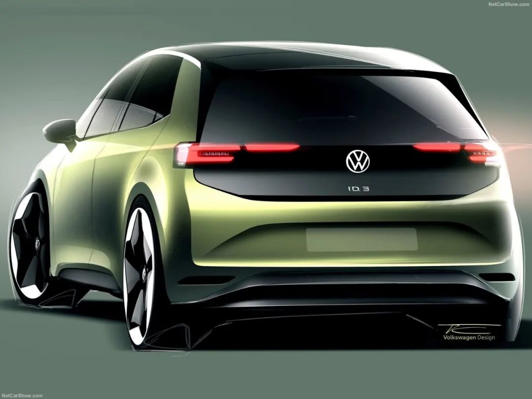车身侧面,新款大众ID.3去掉了C柱上多余的装饰,让其看起来与一辆普通车型没有差别,经典的低风阻轮圈得以继续保留。尾灯看起来更加修长,因为整个尾灯现在都可以完全点亮。同时,新车也将加入新的车漆配色。
