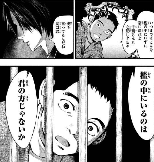 到了仓库那边,关口在洞口喊着京极堂的名字,里面还真的出现了京极堂的身影,关口邀他回旅馆,他老婆都要等急了,这么黑的仓库都像牢笼一样,赶紧走吧。京极堂却回答,你在说什么呢?牢笼中的人不就是你吗?