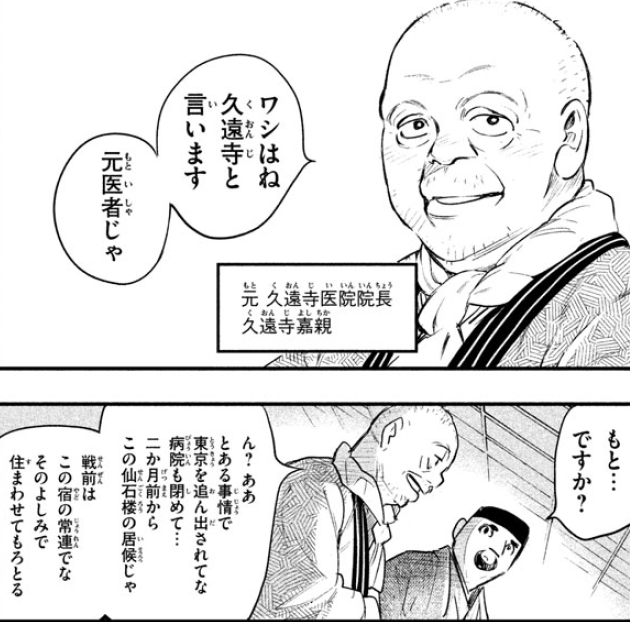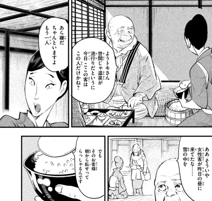 但院长劝今川别去,那寺庙虽然不算很远,可现在这么大的雪要过去也不容易,今川见此只能作罢。这时,女佣带着饭菜进来了,还陪他们聊了一会,院长调侃这旅店也真够冷清的,诺大的店就他和今川两个客人。