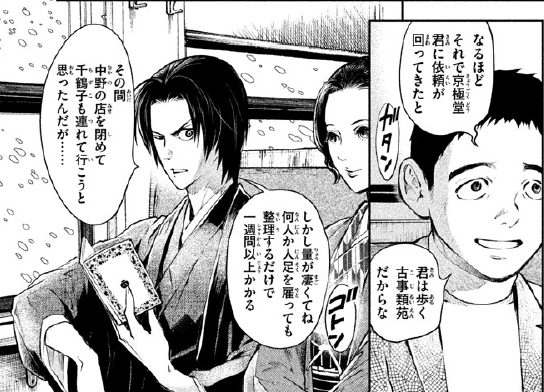 书的数量很多,要全部整理出来怎么也要一周以上,京极堂就把老婆也带上了,又因为怕老婆太寂寞,也就邀请了关口的老婆一起,把关口叫来只是顺便的。反正食宿都由富商全包了,多来几个人也没什么。