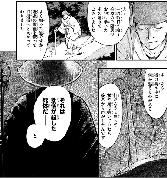 女佣走后,院长又对今川说起明慧寺的事,20多年前他就是这旅店的常客了,当时遇到了一个好像很不得了的和尚去拜访明慧寺,那和尚看起来地位非凡,身上的袈裟金光闪闪,光随从的小和尚就有好几十个。