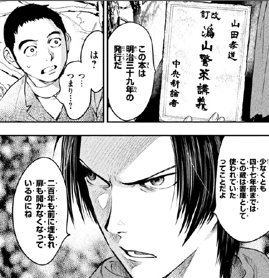 关口怀疑是不是那场两百年前的山崩把寺庙也给埋了,这座仓库只是那寺庙的一角。但京极堂否定了,他还拿出了一本书,那书的出版时间是明治39年(1906年),这说明仓库至少在47年前都还在正常使用。
