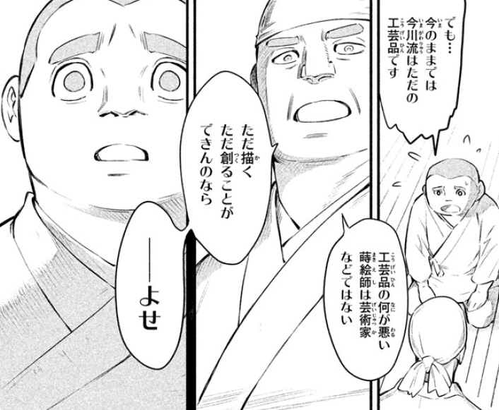 今川无法违抗父亲的意志,但他直到现在都无法理解父亲的意思,为什么说莳绘师不是艺术家?与时俱进有什么不好?今川想不通这些,他也没再画下去,只感觉自己和父亲、兄长都合不来。