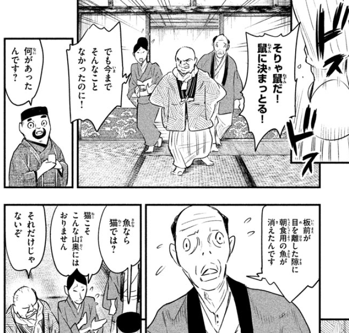 今川好奇旅店里发生了啥,女佣解释说她本来要去找账本,结果发现账本全被啃烂了,还有厨房的鱼也不见了,这么冷的山里肯定没有野猫。
