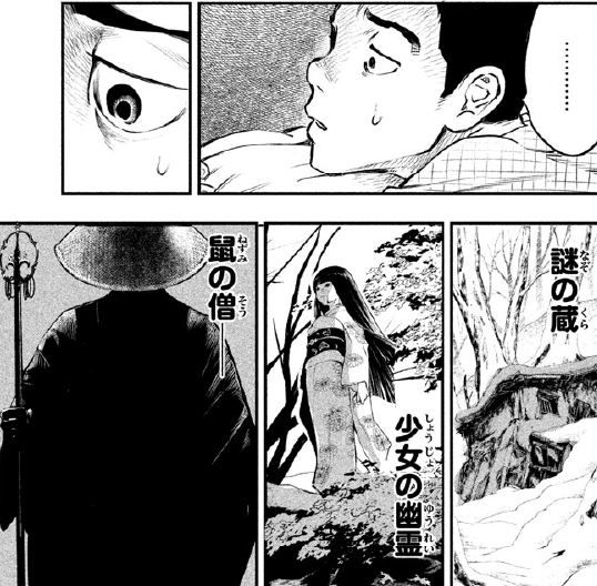 关口还以为老板指的是熊,但老板却说是女孩子的幽灵,那个女孩穿着和服,唱着令人毛骨悚然的歌曲。老板之前就在附近听说过这个传闻,可他一直不信,直到去年的某天,他有事前往富商的别墅。