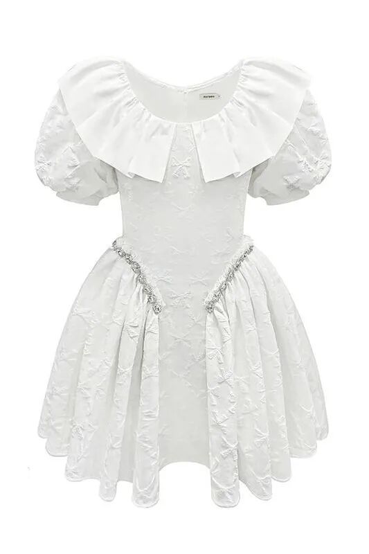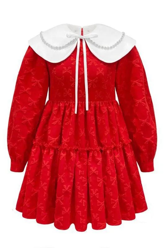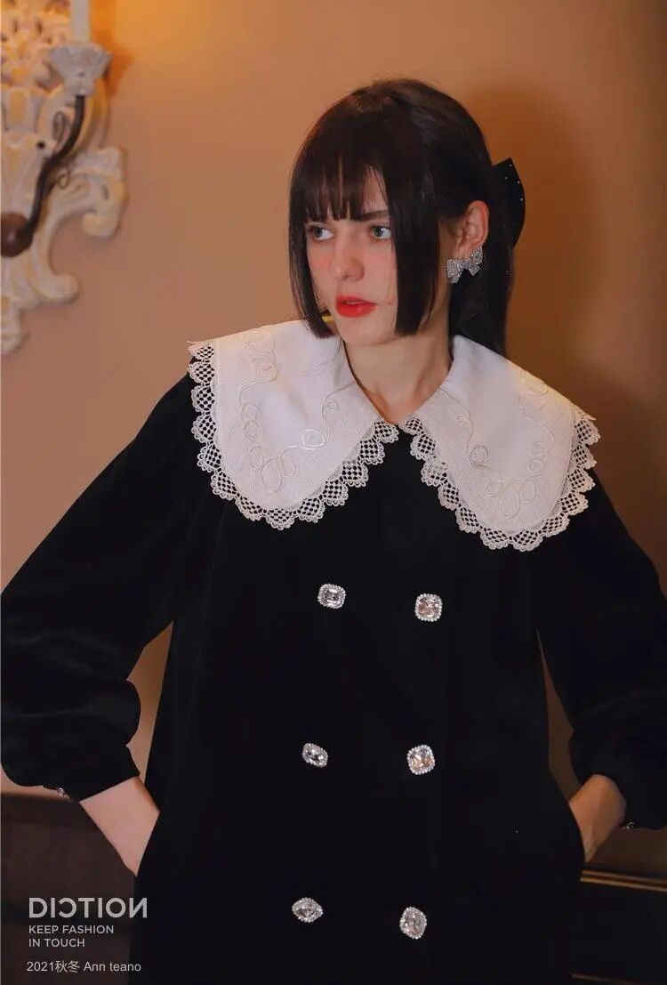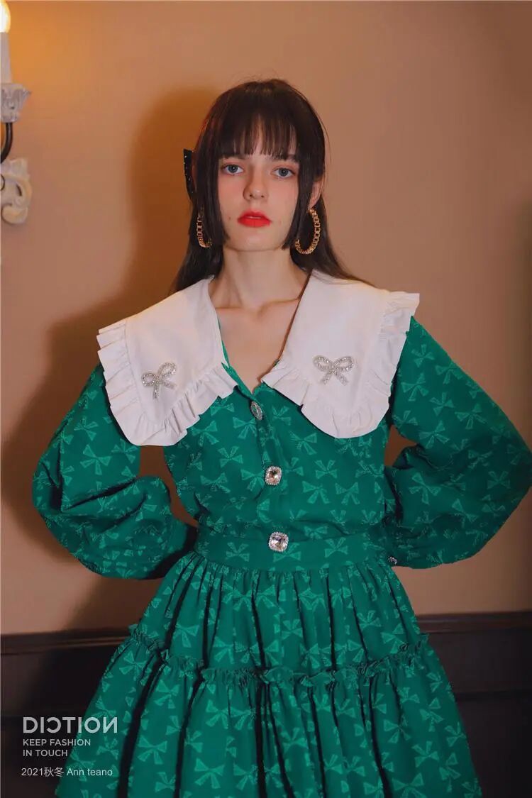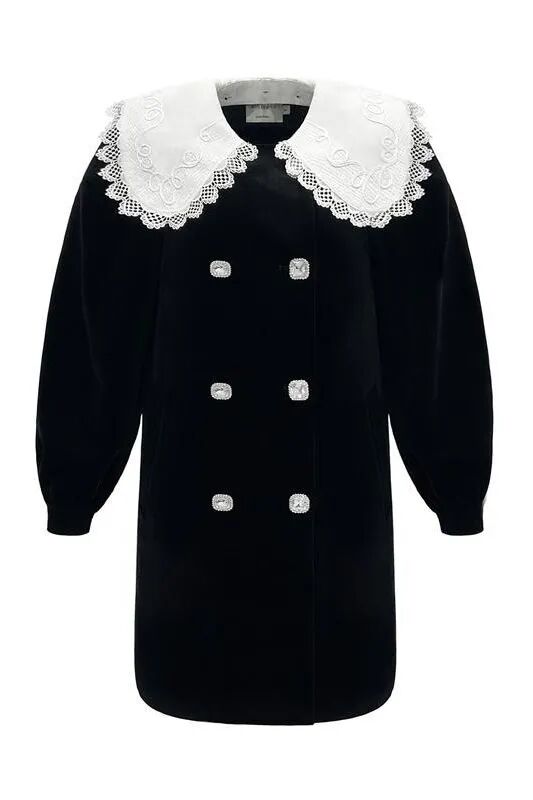 随着新潮创意风的盛行,在领型设计上更加具有视觉张力,设计师将大翻领结合荷叶花边、蕾丝、蝴蝶结装饰物等元素呈现出现代少女感。