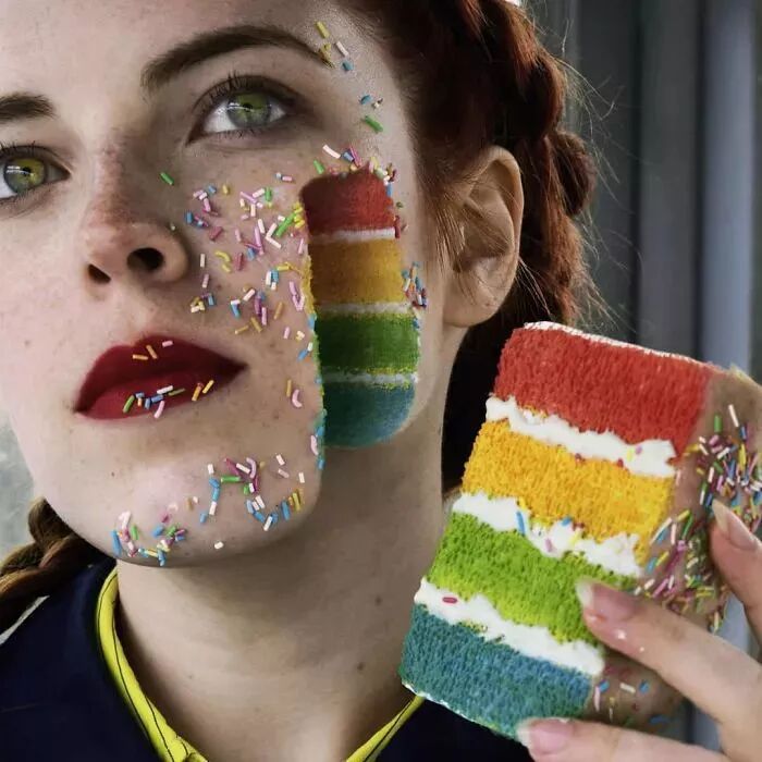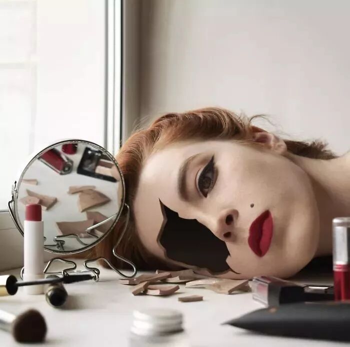 魔幻超现实就是她的主打风格了,脸是作妖表现的主体。可以是打碎的瓷器,也可以是松软的蛋糕。