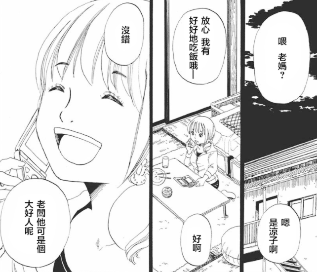 母亲有打过电话问候,她担心凉子,毕竟电视新闻经常有小工厂事故的案例,而凉子笑着说没事。
