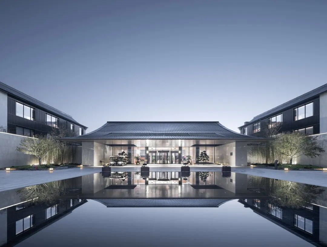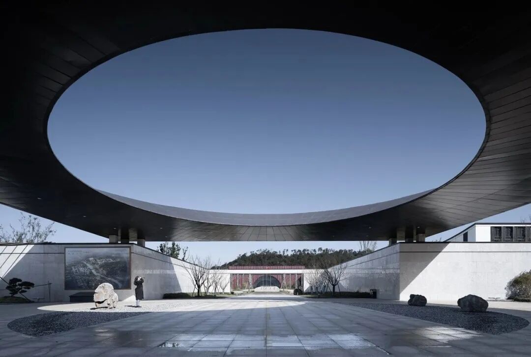 校园核心建筑——永久会址以印章作为主题,统领全局。黑色的柱廊围绕红色的印章构筑,突显核心建筑的人文特色,与周边建筑的白墙共同构成传统书法作品的三色元素——白纸、墨字、红印。半圆形的入口取自史料描述中的“枫桥”形态,与水面倒影互补成一个完整的圆,还原出一个诗意的江南。