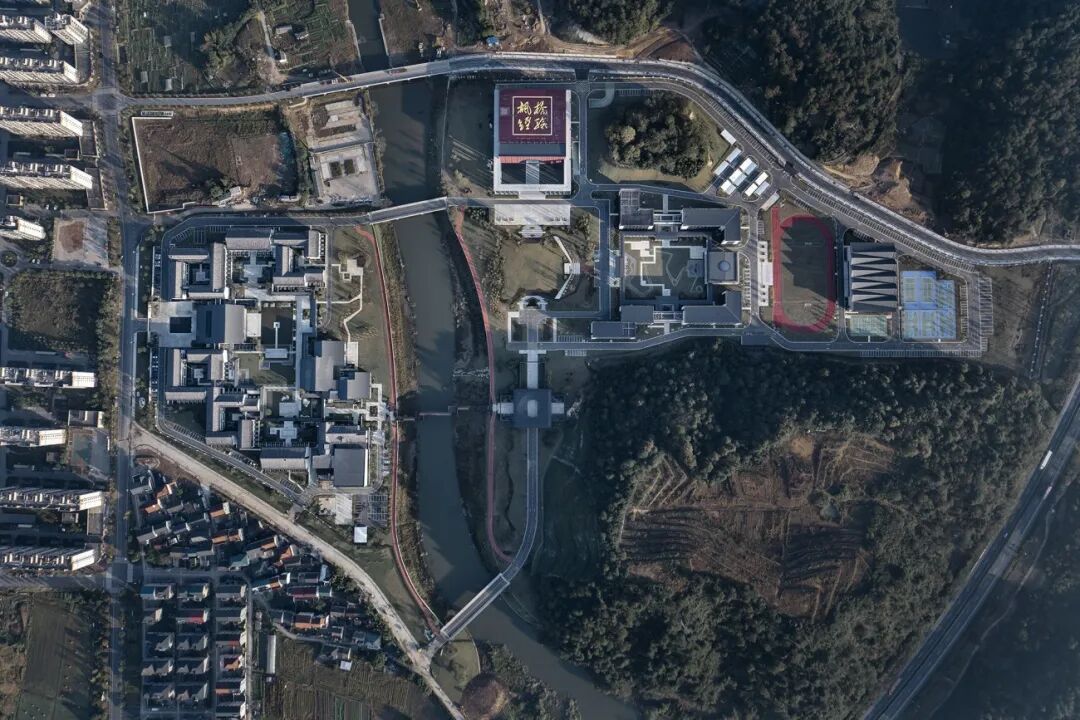 枫桥历代传承的书院精神是教学区体现校镇互溶的重要载体。因此,设计改变教学楼行列布局、教室朝南的基本定式,以传统书院的围合式布局构筑教学区。教学区以序列的柱廊作为空间主体,通过两栋“L”形的教学楼围合成一个围院,并面向枫溪江打开。序列的柱廊代表中国传统的礼制象征及空间秩序,也完成了建筑主体与室外院落的过渡。图书馆被设置在庭院中轴线上,成为礼制空间序列的高潮。