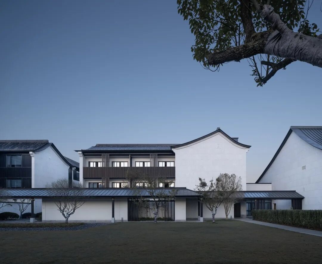 建筑色彩延续了枫桥古镇的色彩系统,但材质却突破对传统的模仿:深灰色铝合金用于屋檐收口,墙面则采用了耐候性更佳的白色花岗岩。现代的材料赋予建筑更简洁、轻盈的构造,细腻的质感及出挑的屋檐使人得以在墙上感受光影流动。