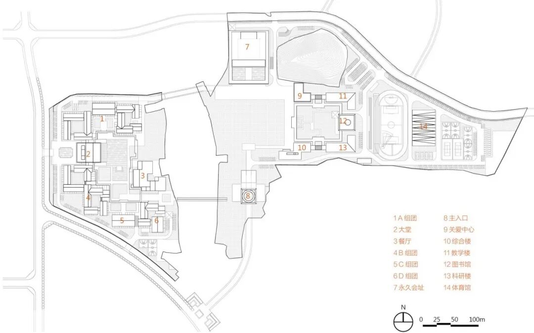 同构:设计希望在保留党校空间特性的基础上,将自然山水及人文特性融入其空间范式中。枫溪江作为核心“变量”,自然成为整个校园空间构架之龙骨。设计将校园主要空间轴线顺应溪流布置,使得自然环境紧密参与到校园空间秩序之中。生活区与教学区也因此在枫溪江的统领下沿自然环境展开。