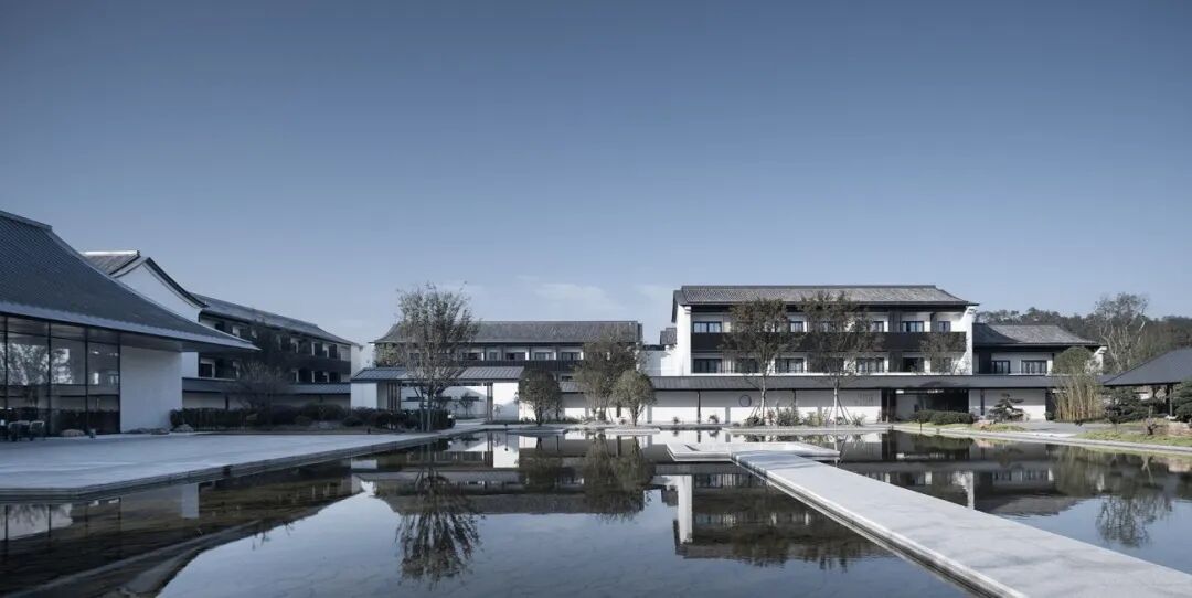 在枫溪江与城市连接的轴线上,布置共享大堂及餐厅等重要公共建筑,从而使生活区与枫溪江建立紧密联系。居住聚落内均设有内部庭院,与生活区的核心庭院连接,组织成为递进的核心院落。建筑体量错落,形成富有魅力的屋顶变化,展现出富有江南韵味的生活情景。