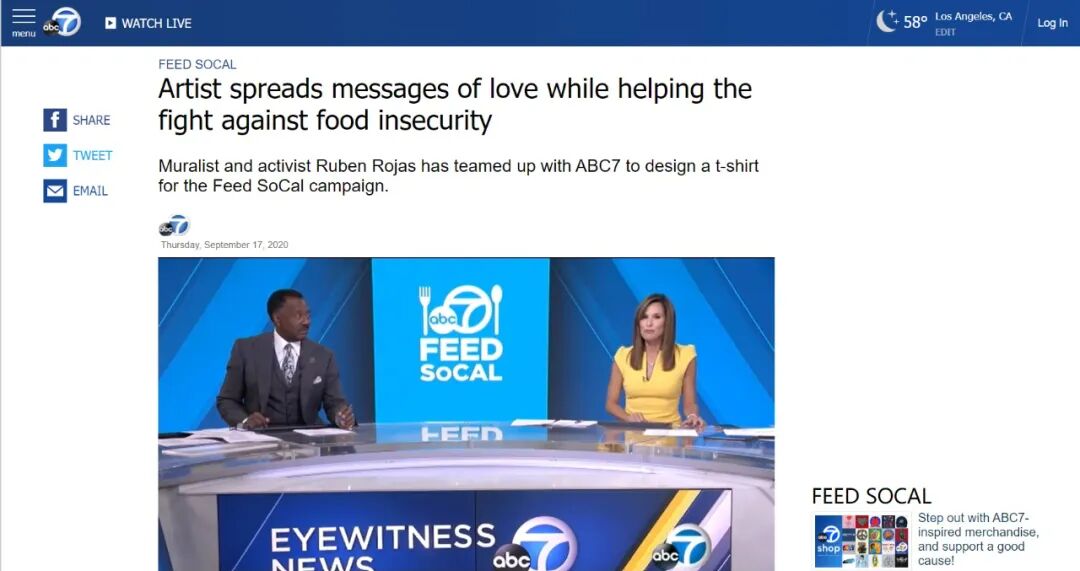 同年,由于美国的粮食问题,为了宣传注重粮食问题提高民众的关注,这位艺术家与ABC7合作设计了一件衬衫,并且最后将销售收益捐赠给 Feed SoCal 活动。此项活动甚至被abc美国广告公司专题报道传播。罗哈斯也算是通过用属于自己的方式,在为这个世界传递着更多的爱。