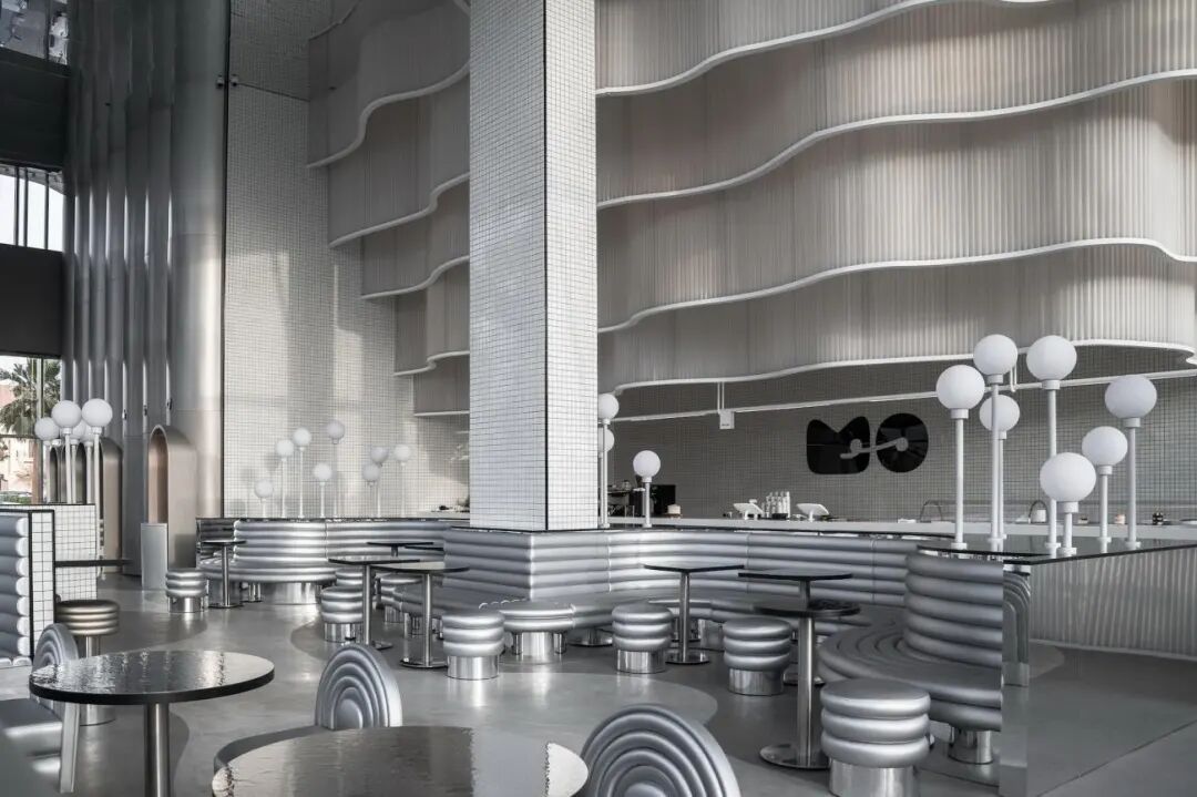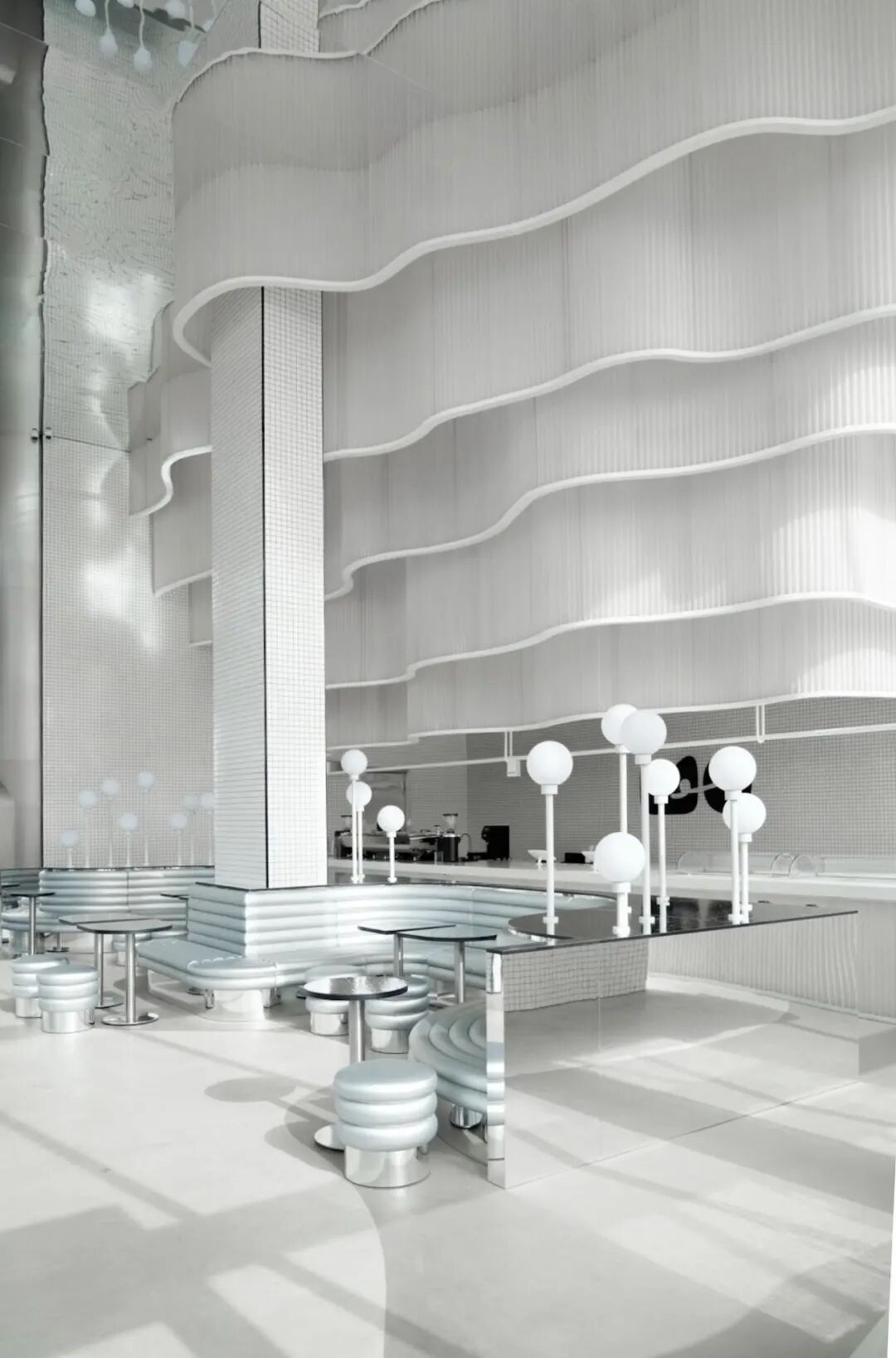 关于家具,每件物品都为该项目进行了定制和设计,提供不同的座位选择,为游客创造不同的体验,从低矮的休息室座位和共用桌子到高凳子和半私人情侣座位。为桌子和织物选择了灰色和白色调色板和金属饰面,以产生反射,从而产生可能被水引起的变形。