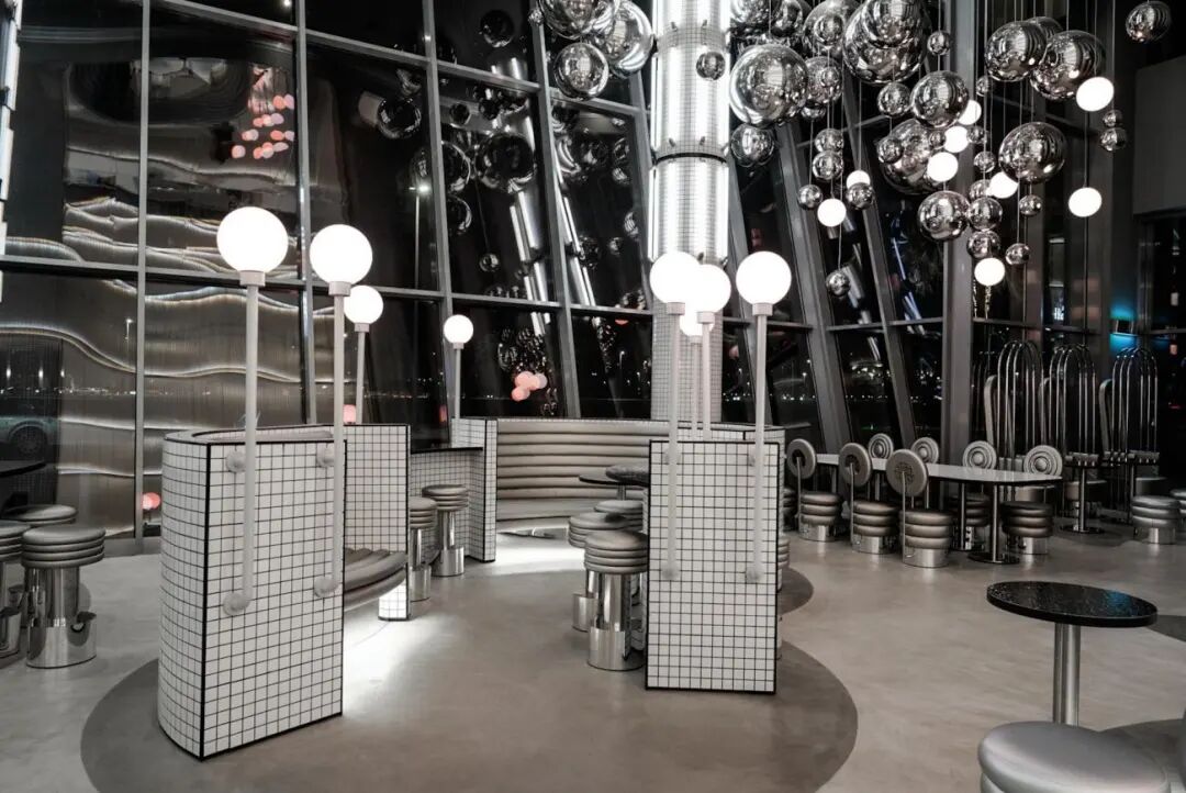 吧台前方是“固态”或“冰”区域,其中代表冰的巨大系列灯是主要吸引点,而在它旁边我们可以看到一些巨大的灯泡,将“气态”展示为一系列火球,以代表糕点在烤箱中烘烤的时刻。