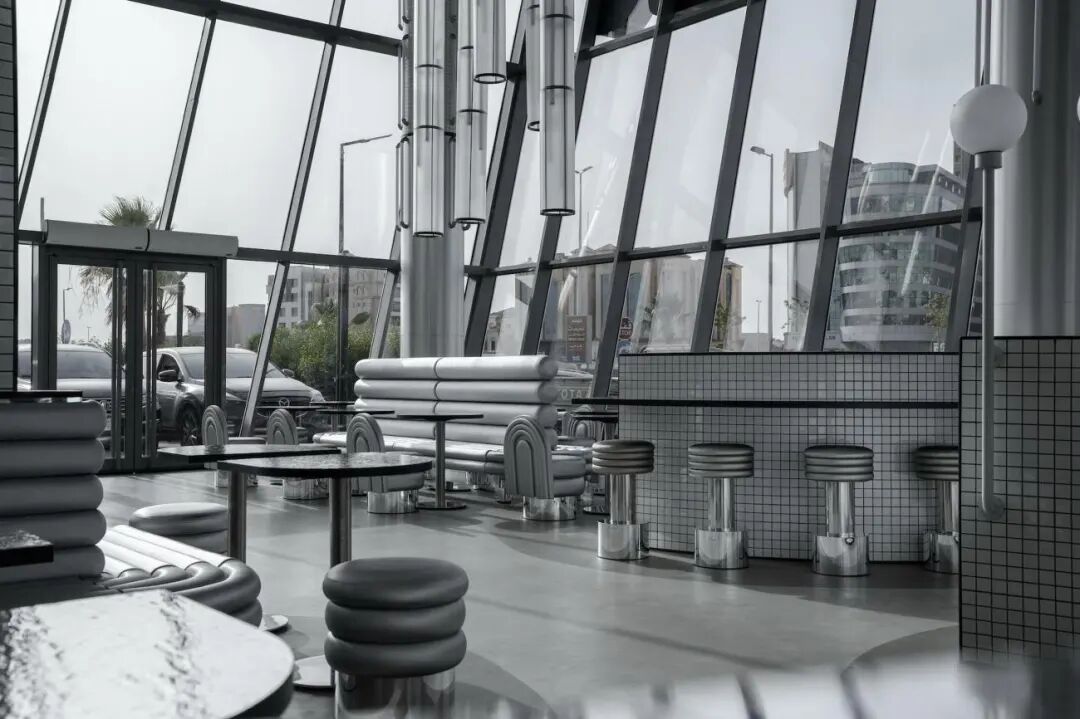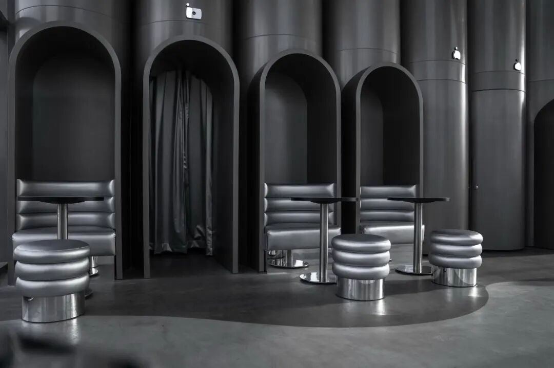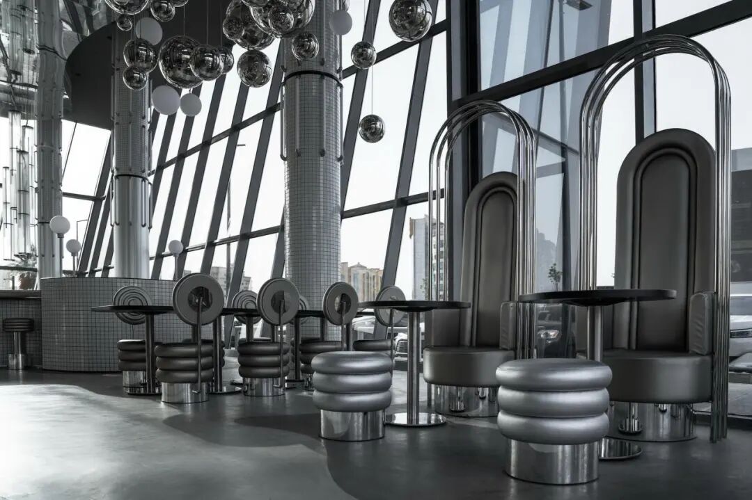 Concerning the furniture, every item has been customized and designed for the project, offering different seating options to create different experiences for the visitors from low lounge seating and shared tables to high stools and semi-private couple seating. A grey and white color palette has been chosen with metallic finishes for the tables and fabrics to generate reflections that create the distortion that could be made by water.