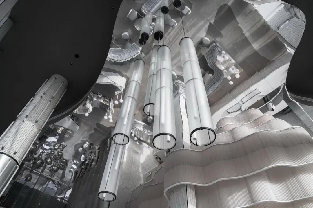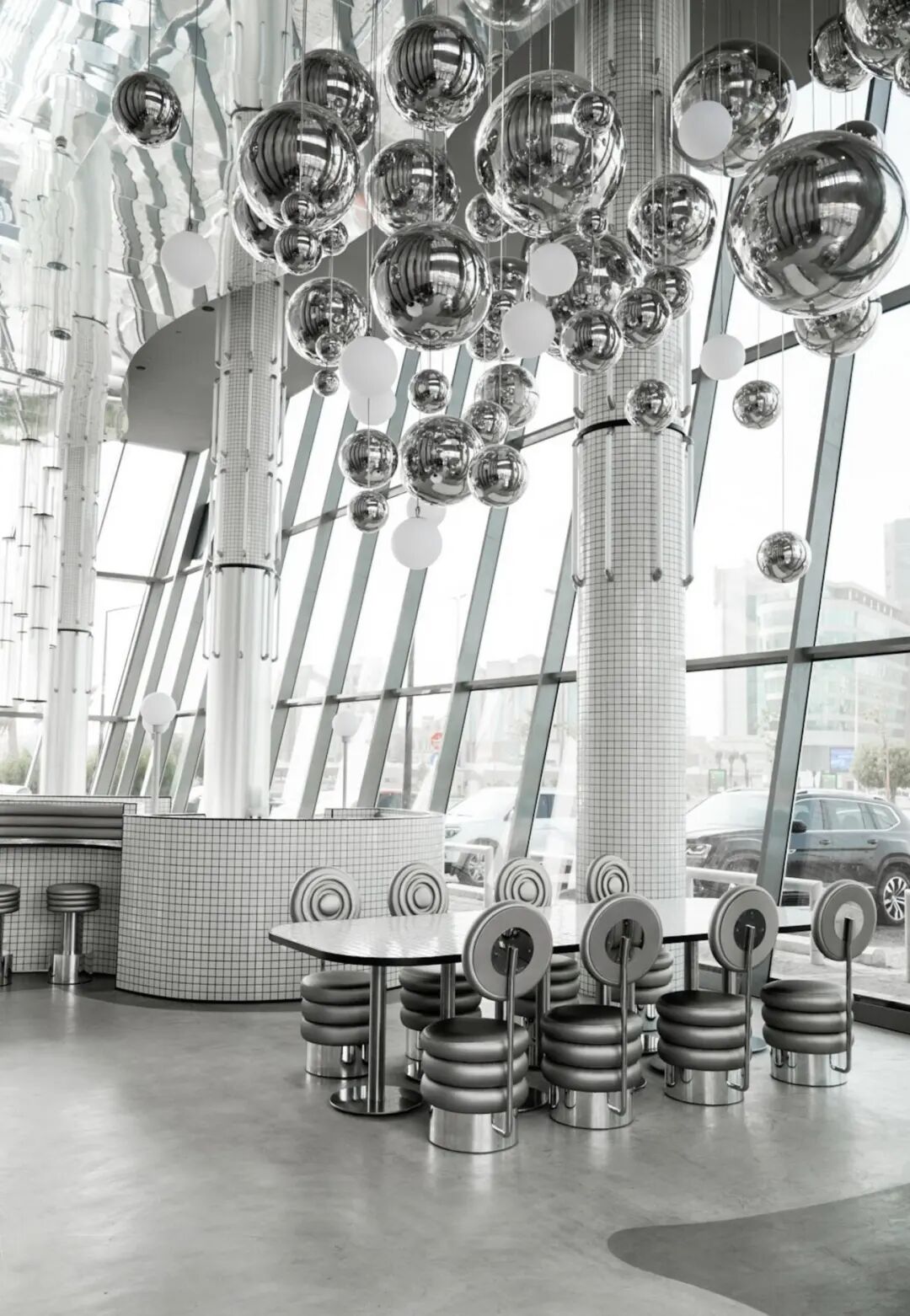 另一方面,照明结合了完全可控的RGB照明来设置可以将空间转换为不同状态的情绪,能够在活动、会话中代表空间内的整体“不同空间”,这也通过镀铬织物,桌子和球体中的空间反射进行扩展,从而创造出另一个层次的光学融合。