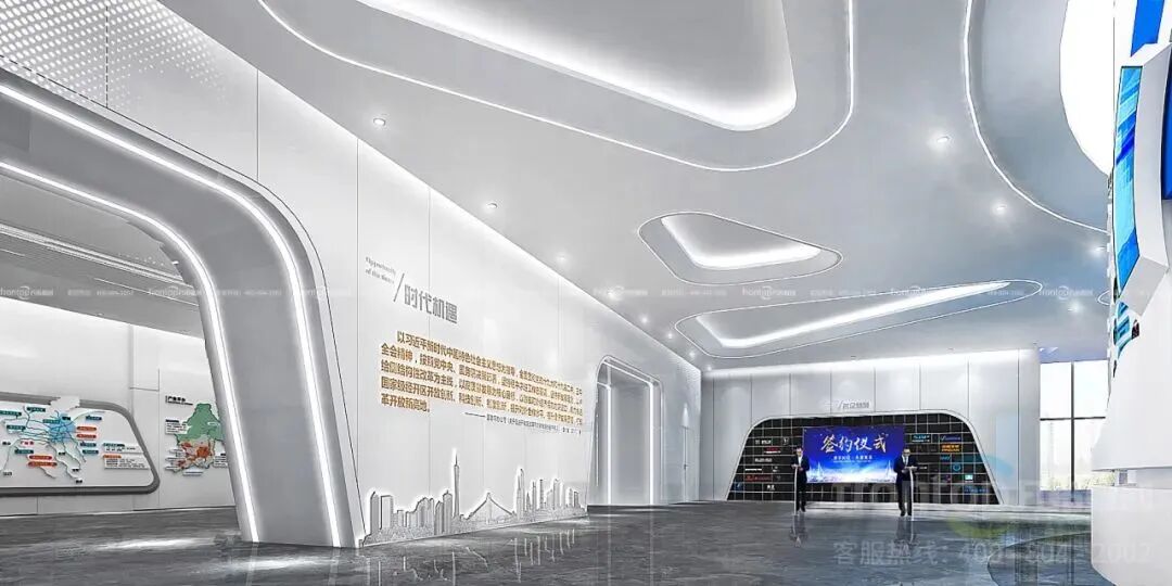 基于“智慧、创新、品质”的鲜明特色和着力点,展厅荟萃三大亮点:一是采取一个智能中枢,一键控制式,实现高度智能化;二是实现两大工艺创新,即超高尺度全铝板立面、大幅版面全磁吸布展;三是360度品质要求,内容、制作、选材、施工每个环节均精益求精,品质追求贯穿始终。